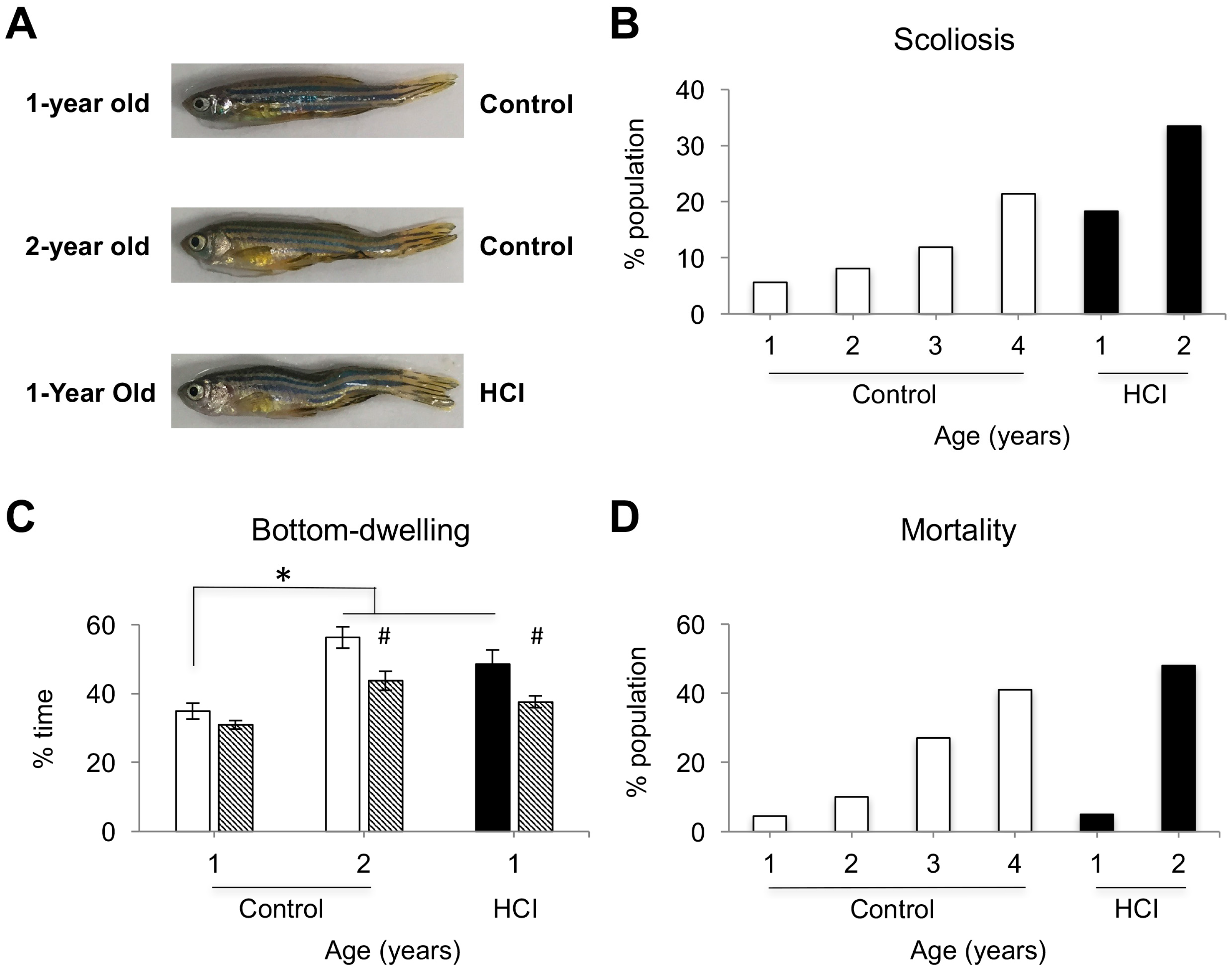 Figure 1. Premature aging phenotype in high caloric intake (HCI) zebrafish: anatomical and behavioral changes, and increased mortality. (A) Images of 1-year old Control, 2-year old Control and 1-year old HCI fish with scoliosis. (B) Percent of fish with scoliosis within each condition; white bar—Control fish, 1–4 years of age, black bar—HCI fish, 1–2 years of age. (C) Bottom-dwelling, time spent swimming at the bottom third of the tank, following no treatment (solid bar) or after Diazepam administration (diagonal stripes), n = 6–8 fish per group, mean ± SEM, * p < 0.05 vs. 1-year old Control; # p < 0.05 Diazepam vs. no treatment. (D) Mortality rate in 1–4 year old Control and 1–2 year old HCI fish (see Section 4.1. for the size of each population).