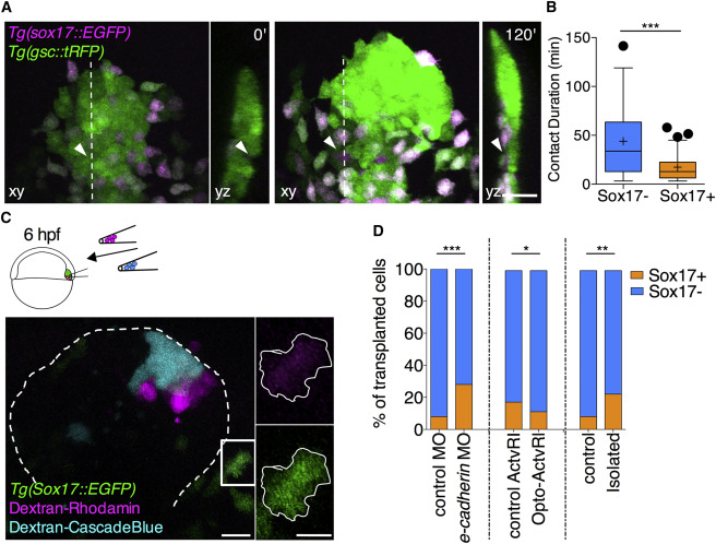 (B) Average contact durations for ppl cells either remaining within the ppl or ppl cells that are about to leave the ppl and turn into sox17::EGFP-expressing endoderm cells. Values are shown as Tukey box-and-whisker plots with median (bar) and average (cross) values. n (sox17-), 56; n (sox17+), 85. Statistical test, Mann-Whitney t test, two tailed. ∗∗∗p < 0.001.