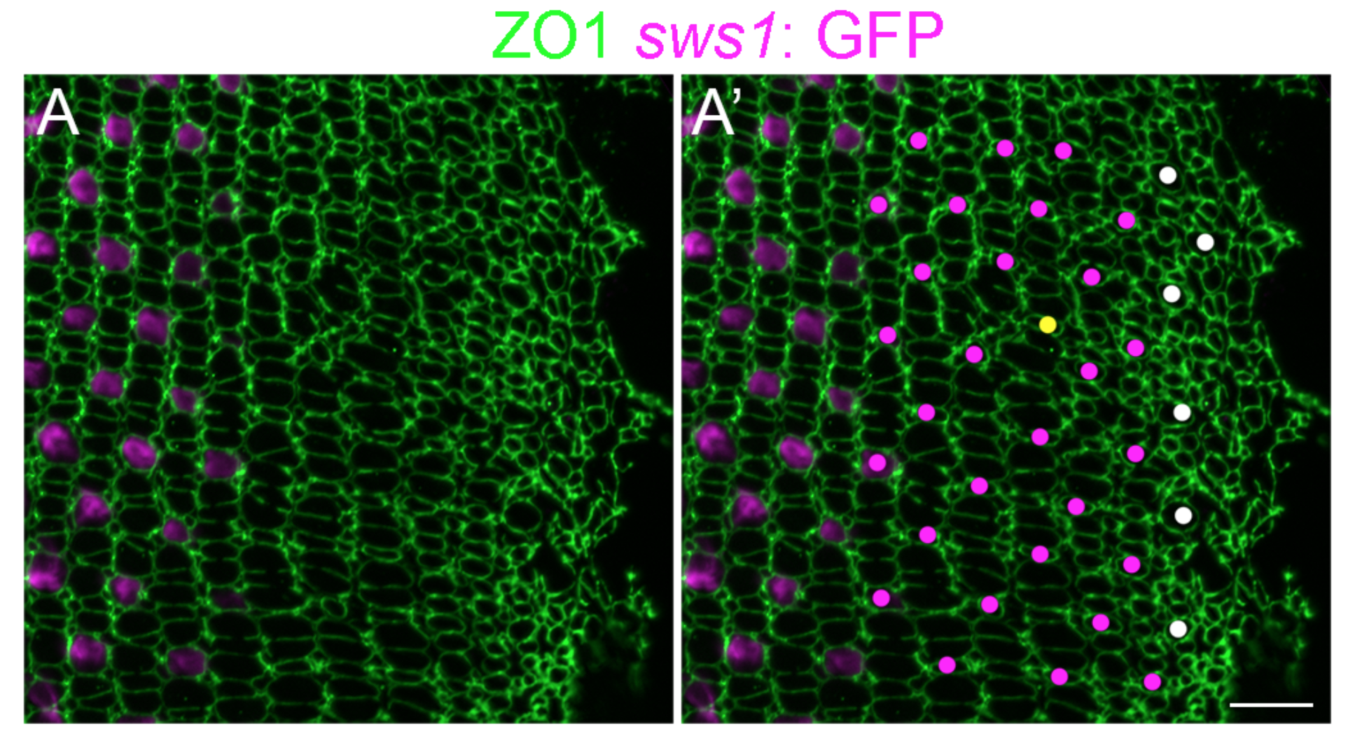 Immature UV cones have rounded apical profiles in the pre-column area. (A, A’) Retinal flat-mount immunocytochemistry for ZO1 (green) in a juvenile transgenic zebrafish with the UV cone reporter, Tg(sws1: EGFP) (magenta). The onset of sws1 opsin transgene expression is delayed in the differentiating UV cones until after the organization of cone columns. (A’) The precision of the mosaic pattern allows profiles that are Tg(sws1: EGFP)-negative to be identified as UV cones (magenta dots), and the position and shape of the large rounded profiles in the pre-column zone (white dots) suggests that these, too, are differentiating UV cones. Note the appearance of a new row and column (yellow dot) in this region, a pattern defect called a ‘Y-junction’ [1], which is analogous to an edge dislocation in crystals grown on curved surfaces and is required to accommodate the increased perimeter with continued retinal growth. Scale bar: 10 μm.