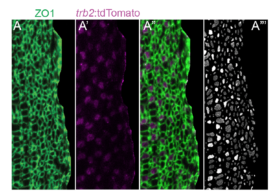 Segmentation and classification of photoreceptor profiles. Selective projection of ZO1-labled cell profiles (A, A’’) and trb2:tdTomato+ Red cones (A’, A’’) in the pre-column zone of a retinal flat-mount. Panel A’’’ shows the tdTomato signal intensity at the level of the segmented ZO-1-labeled cell profiles, which was used for the automated classification and counting procedure described in the Materials and Methods.