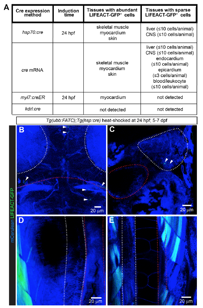 FATC reporter expression is restricted to a few tissues. A, List of tissues containing LIFEACT-GFP+ cells, observed between 4-7 dpf, upon ubiquitous and cell-type specific cre expression in Tg(ubb:FATC) animals. Ubiquitous cre expression by the heat-inducible Tg(hsp70:cre) or injection of cre mRNA in Tg(ubb:FATC) embryos gave rise to LIFEACT-GFP+ skeletal and cardiac myocytes, and skin cells. A few cells in the liver and central nervous system (CNS), were also LIFEACT-GFP+. 4-OHT induction of cardiomyocyte-specific cre expression in Tg(ubb:FATC);Tg(myl7:creER) embryos at 24 hpf led to LIFEACT-GFP+ cardiomyocytes. No LIFEACT-GFP+ cells were detectable in Tg(ubb:FATC);Tg(kdrl:cre) animals in which cre is constitutively expressed in endothelial lineage cells. B-E, Embryos from Tg(ubb:FATC) and Tg(hsp:cre) crosses were heat-shocked at 24 hpf to induce ubiquitous cre expression. While the expression of the ubb:FATC transgene was observed by membrane Cerulean fluorescence (blue) in all tissues, a few LIFEACT-GFP+ cells (green, arrowheads) were detectable in the CNS (B) and the liver (C) at 5-7 dpf. The muscle (D and E) and the skin (not shown) were the only tissues that contained significant numbers of LIFEACT-GFP+ cells. Areas enclosed by white dashed lines are the tectal neuropil (B), liver (C), pancreas (D), and spinal cord (E). Red dashed lines mark the midbrain-hindbrain boundary (B), gall bladder (C), intestine (D), and dorsal aorta (E). All images are maximum intensity projections of 20-60 μm thick confocal stacks. B is dorsal view, anterior up. C-E are lateral views, dorsal to the left, anterior up. 12-39 animals were examined for each cre expression method.