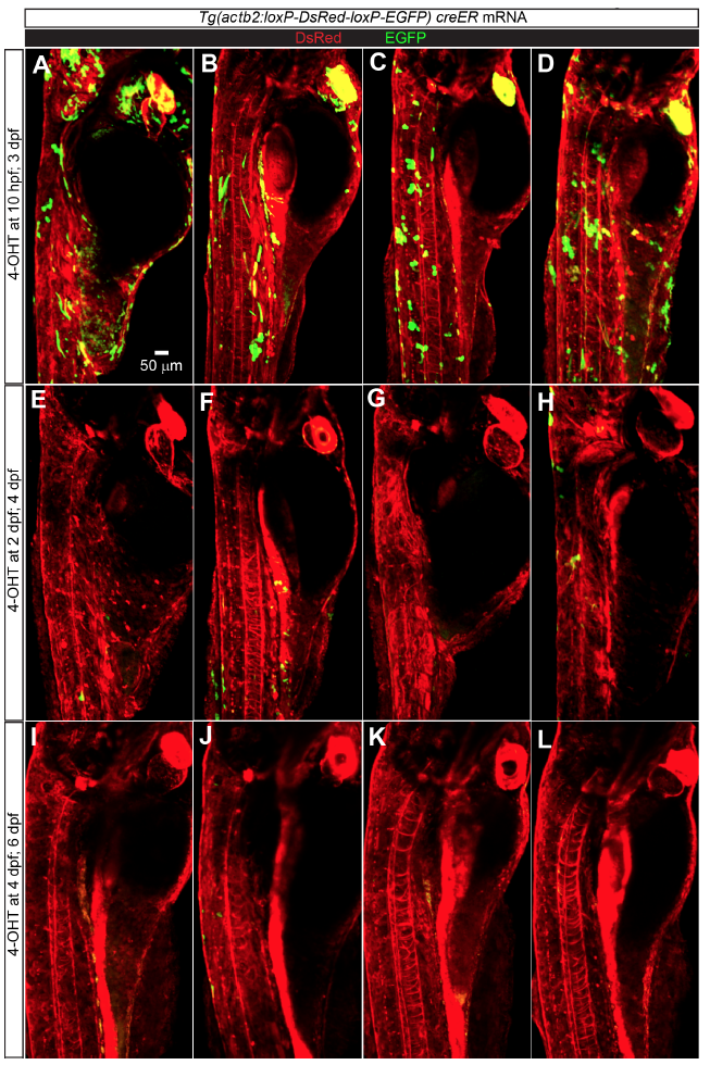 Cre activity from injected creER mRNA appears to be lost by 4 days. Tg(actb2:loxP-DsRed-loxP-EGFP) embryos were injected with creER mRNA at the 1-4 cellstage. Embryos and larvae were then subjected to an overnight treatment with 4-OHT at 10 hpf (A-D), 2 dpf (E-H), or 4 dpf (I-L). Images were acquired 48 hours after the 4-OHT pulse. Cre activity was detectable by EGFP expression (green). DsRed expression (red) persisted in cells with no Cre activity. All images are maximum intensity projections of 200-350 μm thick confocal stacks and are shown in lateral views, dorsal to the left, anterior up. 6-10 animals were examined for each experimental condition.