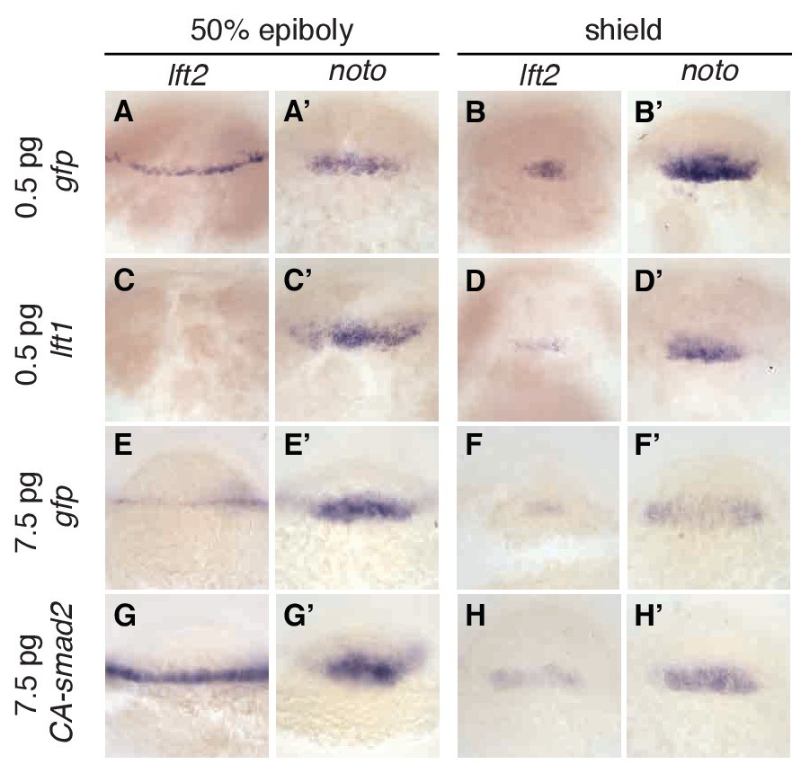 Wild type embryos at the one-cell stage were injected with 0.5 pg gfp mRNA (first row, (A–B’)), 0.5 pg lft1 mRNA (second row, (C–D’)), 7.5 pg gfp mRNA (third row, (E–F’)), or 7.5 pg CA-smad2 mRNA (fourth row, (G–H’)). Embryos were fixed at 50% epiboly and shield stages and expression of endogenous lft2 (A,B,C,D,E,F,G,H) and the mesoderm marker noto (A’,B’C’,D’,E’,F’,G’H’) were assessed using in situ hybridization. Note the dramatic decrease and increase in lft2 expression after lft1 (A,B,C,D) and CA-smad2 injection (E,G,F,H), respectively. Expression of noto was relatively unchanged in all treatments.