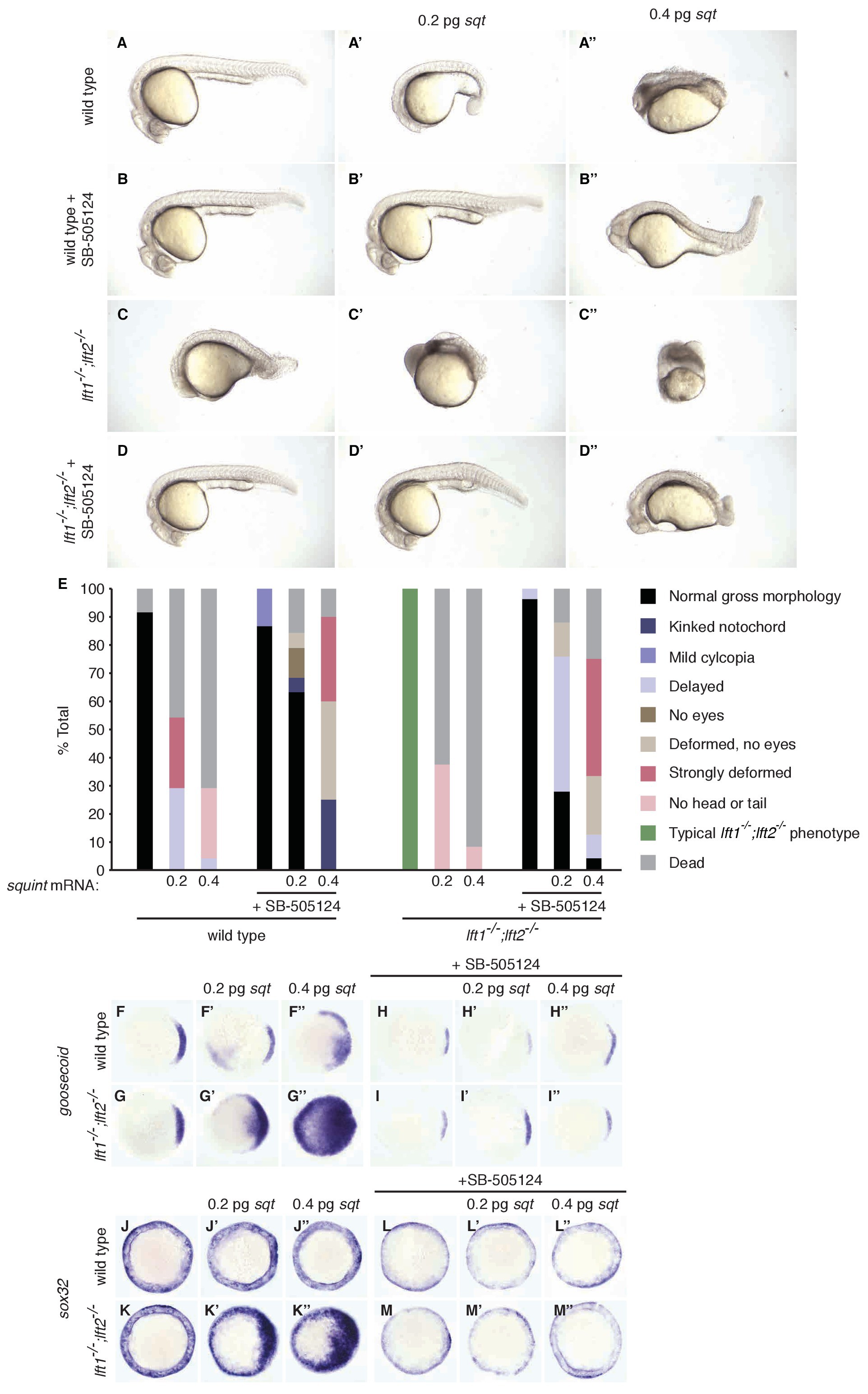 Response of wild type and lefty1-/-;lefty2-/- mutant embryos to squint injection.