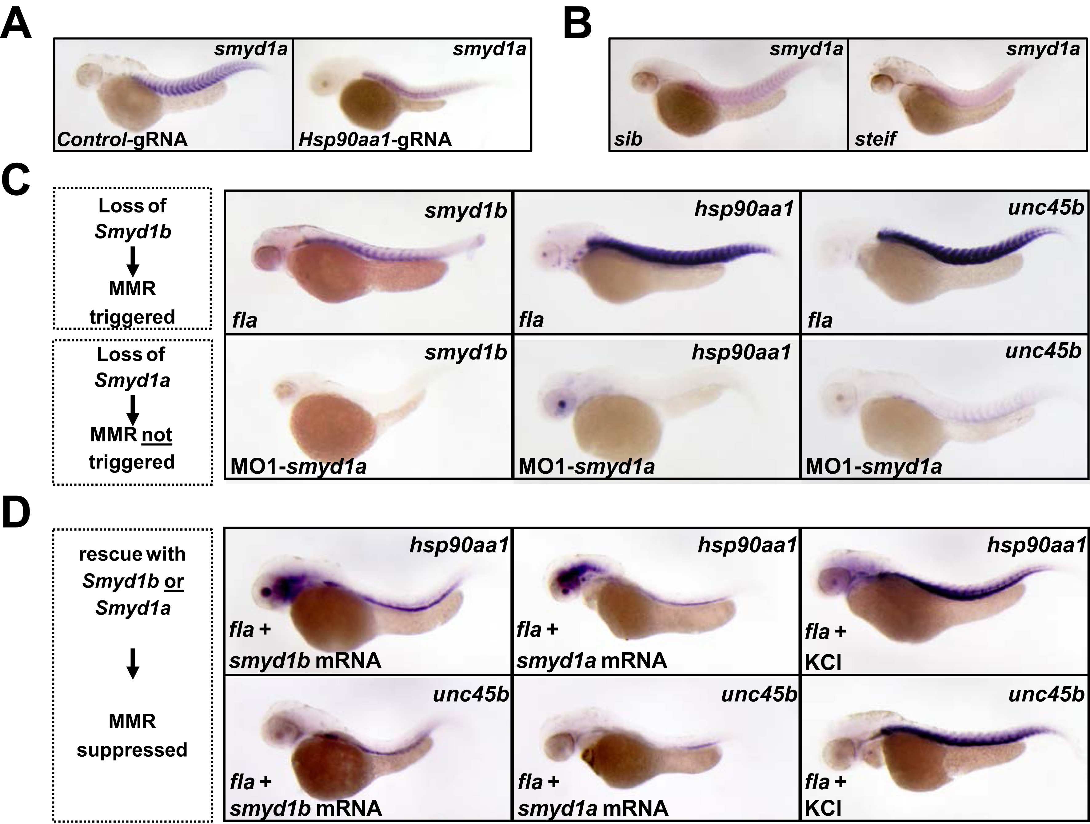 Loss of Smyd1a does not trigger the misfolded myosin response. (A) ISH analysis of smyd1a expression in unc45b mutant embryos (steif) or embryos injected with a Cas9-protein/hsp90aa1-gRNA complex, respectively. (B) mRNA levels of the muscle chaperones unc45b and hsp90aa1 are strongly upregulated in muscle cells of fla mutants, whereas their expression is not affected by loss of smyd1a. (C) Rescue of fla mutants by injection of either smyd1a- or smyd1b-mRNA.