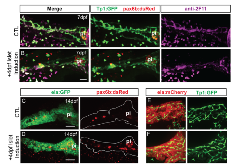 (A, B) Confocal image stacks of pancreas at 7 dpf from control and islet-induced samples transgenic for Tp1:GFP and pax6:dsRed. Samples were immunostained with anti-GFP and anti-2F11. Scale bar = 25μm. (C, D) Confocal image stacks of pancreas at 14 dpf from control and islet-induced samples transgenic for ela:GFP and pax6:dsRed, immunostained with anti-dsRed. Scale bar = 100μm. (E, F) Confocal image stacks of pancreas at 14 dpf of representative control and islet-induced samples transgenic for ela:mCherry and Tp1:GFP, immunostained with anti-GFP. Scale bar = 25μm. pi, principal islet.