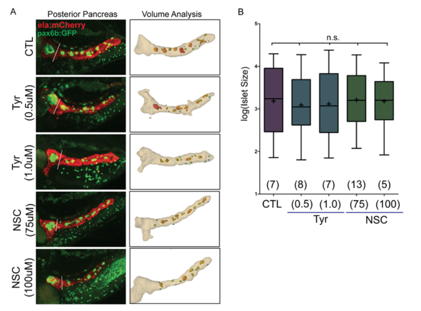 (A) Representative images from islet assembly assay and analysis (as in Fig. 6B), showing automated detection of secondary islets in control (DMSO-treated) samples and larva treated with EGFR inhibitor (Tyr) and Rac1 inhibitor (NSC) at the indicated concentrations. (B) Quantitation of secondary islets using the automated method, graphed after log transformation to display the full range of values. Boxes extends from the 25th to 75th percentile, whiskers indicate 5th and 95th percentile, line indicates the median, mean is indicated by '+'. Islet volumes in treated samples are not significantly different from DMSOtreated controls. (p=0.6599, ANOVA followed by Dunnett’s Multiple Comparison Test). Number of larvae per group as indicated. CTL, 111 objects; Tyr (0.5μM), 115 objects; Tyr (1.0μM), 93 objects; NCS(75μM), 153 objects; NCS(100μM), 55 objects.