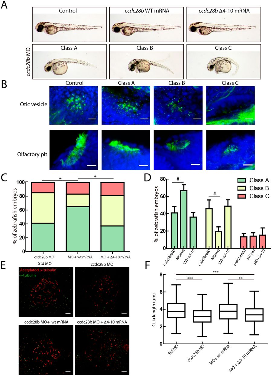 A Δ4–10 ccdc28b mutant does not rescue the morphant phenotype in zebrafish. (A) 48 hpf control and injected zebrafish embryos are shown. While injecting either wt or mutant ccdc28b mRNA does not result in phenotypic alterations, injection of the ccdc28b MO results in a range of phenotypes from mild to severe corresponding to Class A to C respectively. Representative images of each class are shown. (B) The severity of the external morphological phenotype in the different classes correlates with an increasing perturbation of ciliated tissues. Otic vesicle and nasal pit are shown. (C) The class distribution upon injection of morpholino alone (ccdc28b MO) and morpholino co-injected with either wt or Δ4–10 mutant ccdc28b mRNA was compared. Data from five independent injections were pooled reaching 128 ccdc28b MO, 65 ccdc28b MO + wt mRNA and 63 ccdc28b MO + Δ4–10 ccdc28b mRNA embryos. A rescue of the phenotype was observed only upon injecting the wt mRNA but not the Δ4–10 mutant. Statistical test: χ2; *P < 0.01. (D) The percentage of embryos in each phenotypic class was calculated for the five individual experiments. The mean and SEM (bars) are plotted. The differences between conditions (#) were analyzed using the Wilcoxon rank test (P = 0.06 for class A; P = 0,05 for class B) and paired t-test assuming normal distribution (P = 0.02 for both class A and class B). (E) Cilia and basal bodies in KV were visualized with anti-acetylated (red) and anti-γ-tubulin (green) respectively. Representative images for control, ccdc28b MO, and ccdc28b MO embryos co-injected with either ccdc28b wt or Δ4–10 mRNA. (F) Cilia length was measured using ImageJ (355 cilia for Std. MO, 336 for ccdc28b MO, 276 for ccdc28b MO + wt mRNA, 266 ccdc28b MO + Δ4–10 mRNA). Cilia are significantly shorter in ccdc28b MO embryos and length is rescued upon co-injection of wt ccdc28b mRNA but not with the Δ4–10 ccdc28b mRNA. Statistical test: Kruskal Wallis. **P < 0.01, ***P < 0.001. Scale bars correspond to 10 μm.