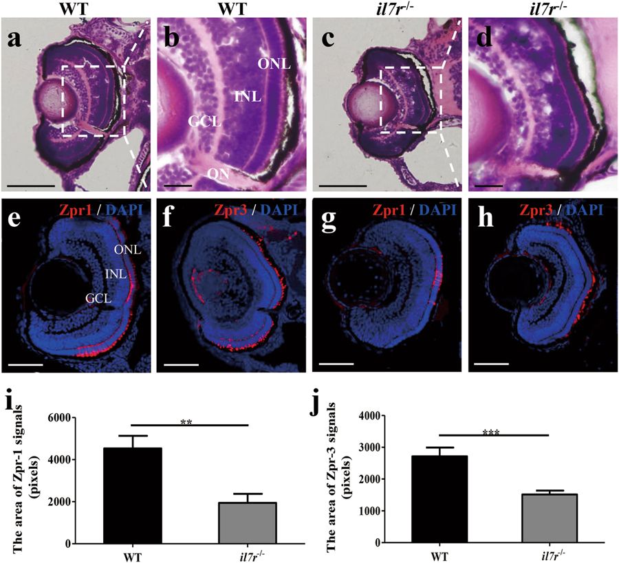 a-d HE staining and magnified images of retinas from wild-type (WT, a and b) and il7r−/− (c and d) embryos at 72 hpf. e–h Images of Zpr1 or Zpr3 immunofluorescence staining of retinas in WT (e and f) and il7r−/− (g and h) embryos at 72 hpf. i-j Statistical analysis of Zpr1-positive signals (i) and Zpr3-positive signals (j) between WT and il7r−/− retinas. Note that the Zpr1-positive area (i) and Zpr3-positive area (j) are significantly decreased in il7r−/− retinas. Results are represented as means ± SEM (n = 10), **P < 0.01, ***P < 0.001. Scale bar: a and c, 40 μm; b and d, 10 μm; e–h, 50 μm. GCL ganglion cell layer, INL inner nuclear layer, ONL outer nuclear layer, ON optic nerve
