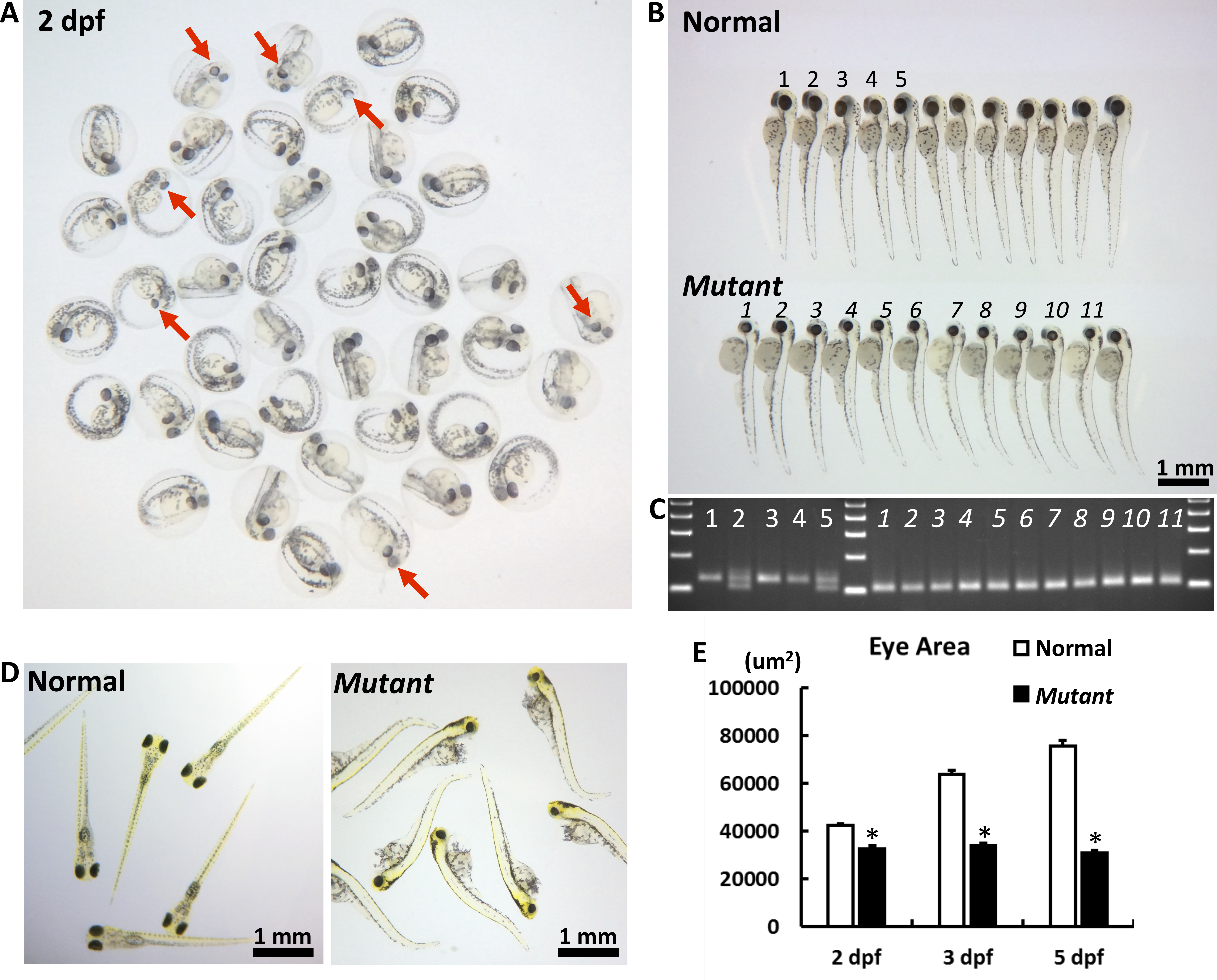 The macroscopic eye phenotype of the cct2-L394H-7del mutant. (A) The representative picture of F3 embryos from F2 cross mating at 2 dpf. At this stage, some embryos had smaller eyes with reduced pigmentation (marked by red arrows) compared with most embryos. (B) The representative picture of F3 embryos from F2 cross mating at 3 dpf. At this stage, the homozygous cct2-L394H-7del mutant embryos (lower row) were easily distinguished from wild-type and heterozygous cct2-L394H-7del embryos (upper row) by smaller size and circular shape of their eyes. The numbering (1–5 for normal eye and 1–11 for smaller eye larvae) is identical to the numbering in (C). (C) The genotyping of embryos labeled in (B) by PCR. The wild-type allele produces a 125-bp band, while the mutant allele produces a 101-bp band. (D) The representative picture of F3 embryos from F2 crossmating at 5 dpf. At this stage, wild-type and heterozygous larvae start to swim, while homozygous mutant larvae are not able to swim. (E) Comparison of the eye area between normal versus homozygous cct2-L394H-7del mutant embryos at 2, 3, and 5 dpf. *P < 0.05.