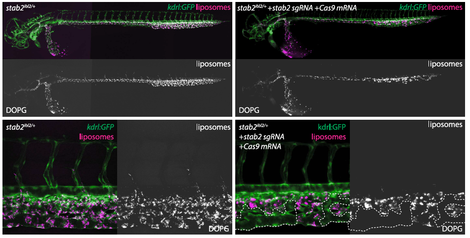 Clonal stab2 deletion. Whole-embryo and cellular views of DOPG liposome distribution in stab2ibl2/+; kdrl:GFP+ embryos. CRISPR/Cas9 introduced mutations in the wildtype allele generated clones of cells without stab2 function. In stab2 sgRNA and Cas9 mRNA injected, but not control embryos, endothelial cell clones are observed in which DOPG accumulation is abrogated, indicating a requirement for stab2 function within SECs.