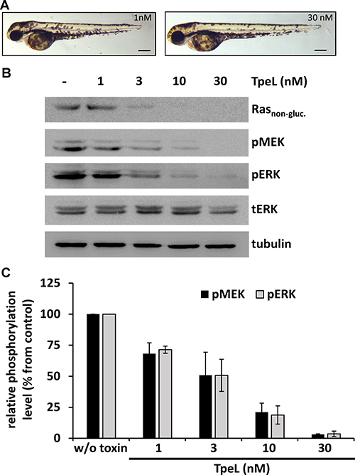 TpeL treatment reduces Ras-dependent hyperproliferation of melanocytes in vivo. (A) Micrographs of zebrafish larvae with Ras-dependent hyperpigmentation at 60 hpf treated with low (1 nM) and high (30 nM) concentrations of TpeL from 12 hpf on. A reduced pigmentation in the high TpeL concentration treated fish is seen over the whole larvae. The scale bar represents 0.1 mm. (B) TpeL- or untreated zebrafish larvae were pooled to 20 embryos per condition and lysed. Subsequently, Rasnon-gluc., pMEK, pERK, tERK, and tubulin were probed by immunoblotting. A representative blot of three independent experiments is shown. (C) Statistical analysis of phosphorylated MEK and ERK following treatment with TpeL as presented in B.