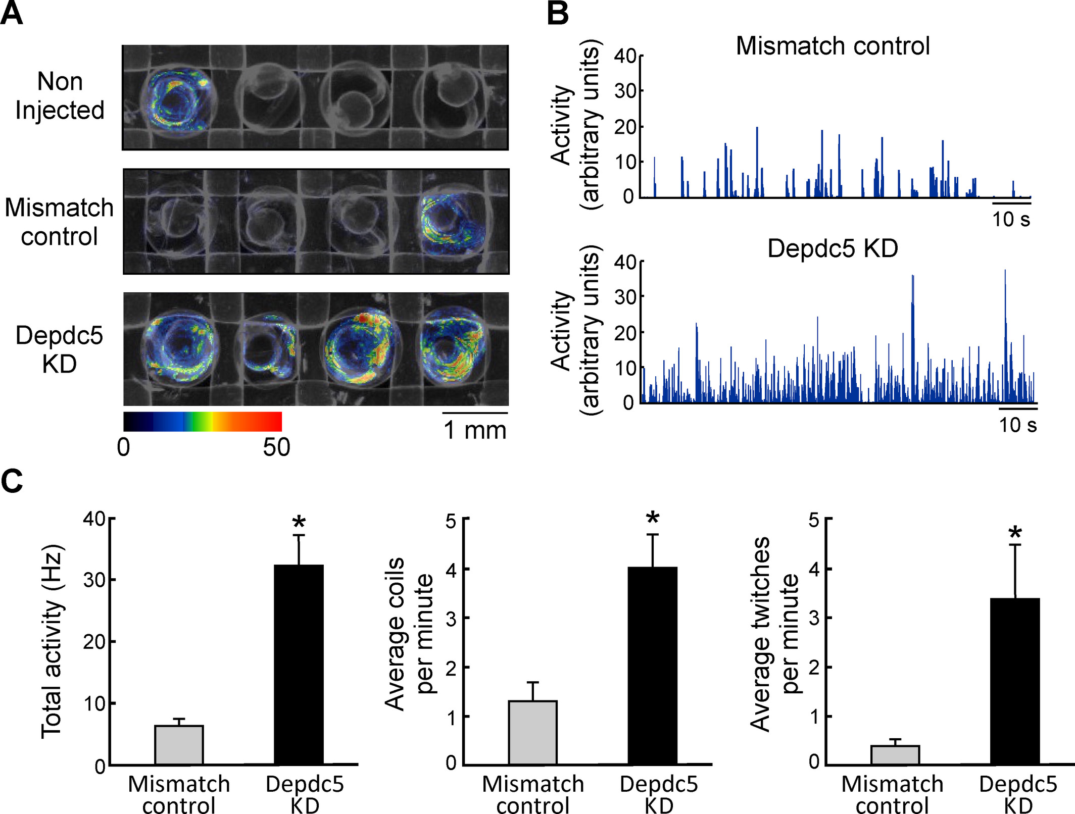 Depdc5 knockdown larvae show an early hyperactive motor phenotype. (A) Locomotor activity heatmap illustrating spontaneous movement in 28 hpf larvae inside the chorion over a period of 1 min showing an increase in general movement in the Depdc5 knockdown (KD) larvae as compared to mismatch and noninjected controls. (B) Parameters of the same activity showing increased frequency and amplitude of movement in Depdc5 KD animals. C. Quantification of total activity showing a significant hyperactive phenotype in the Depdc5 KD. Both the coiling and twitching frequency were significantly increased as compared to controls.