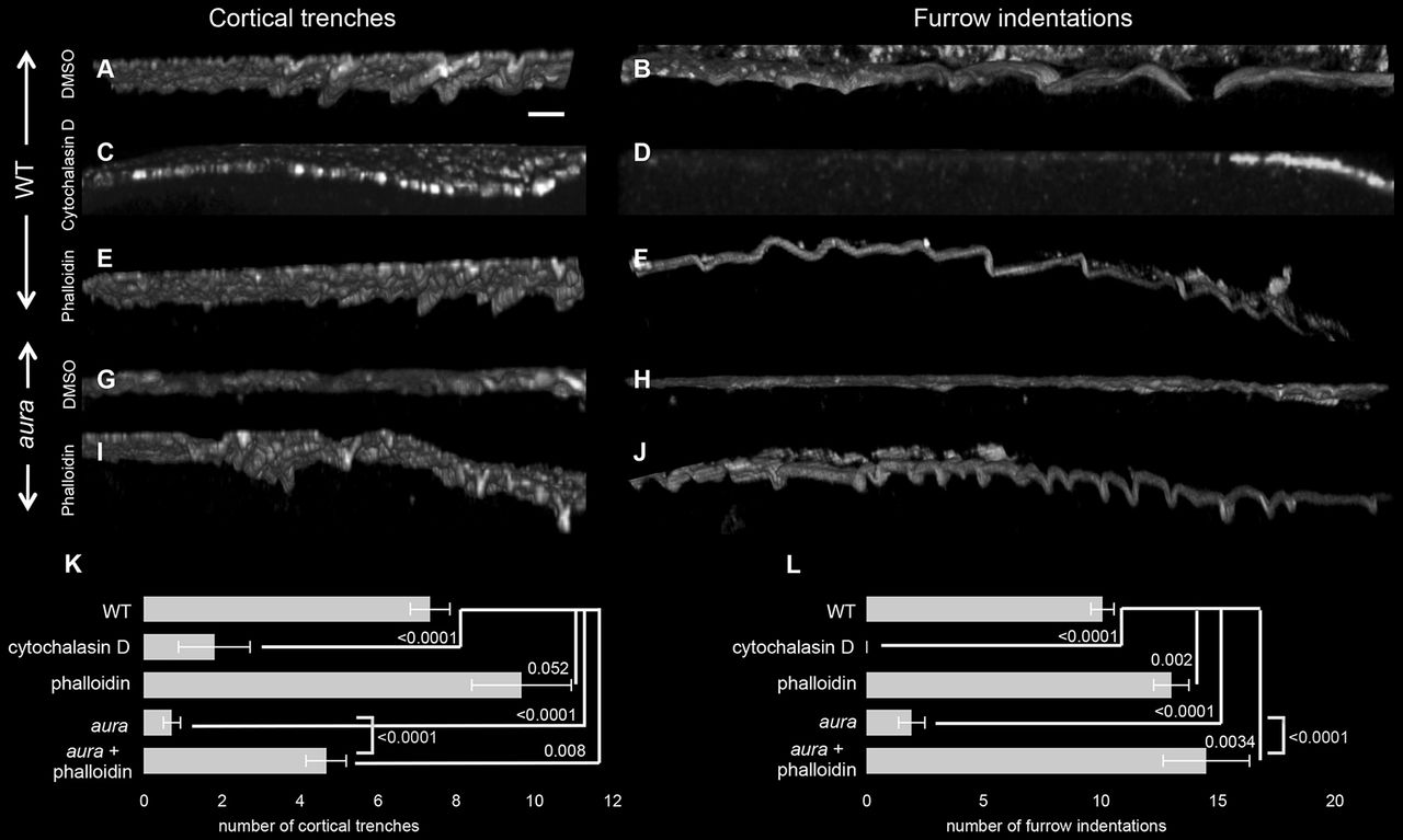 F-actin cortical trenches and furrow indentations depend on aura/mi1ip1L function. (A-J) Orthogonal views of cortical and furrow F-actin in wild-type and aura mutant embryos treated with drugs targeting F-actin. Wild-type embryos exhibit cortical trenches (A) and furrow indentations (B), which are missing in aura mutants (G,H). In wild type, actin inhibition with cytochalasin D abolishes the formation of both cortical trenches (C) and furrow indentations (D). Treatment with the F-actin stabilizer phalloidin allows cortex trenches (E) and furrow indentations (F) in wild type and rescues the formation of these structures in aura mutants (I,J). (K,L) Quantitation of the number of cortical trenches and furrow indentations under the various conditions, using data from at least seven images per condition. Significance was determined using an unpaired t-test. Data are mean±s.e.m. Scale bar: 10 μm.