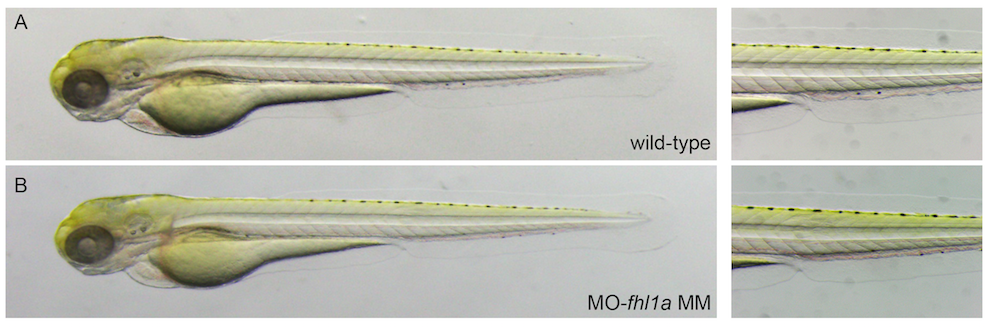 Phenotype of mismatch Morpholino oligonucleotide (MO-fhl1a MM)-control-injected zebrafish embryos at 72 hpf. Absence of heart and skeletal muscle abnormalities in the control-injected zebrafish embryos (B) compared to wild-type embryos (A) confirms specificity of the MO-oligonucleotide mediated knockdown of fhl1a.