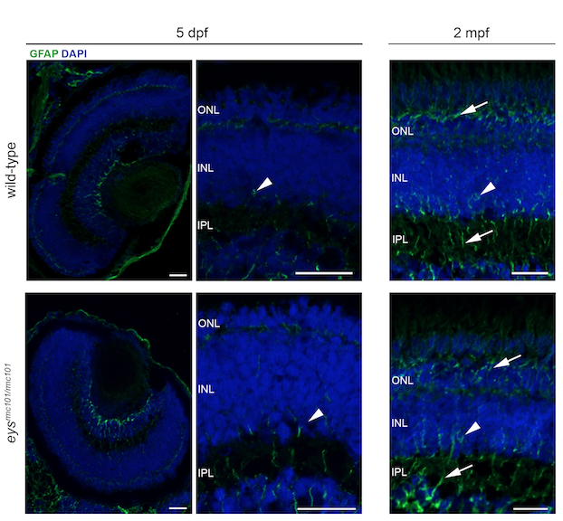 Retinal sections of wild-type and eysrmc101/rmc101 zebrafish at 5 dpf and 2 mpf stained with antibodies against GFAP (green), as a marker for Müller glia cells. Müller glia cell bodies are located in the inner nuclear layer (arrow heads) and project processes (arrows) in either direction to outer limiting membrane and inner limiting membrane. Nuclei are counterstained with DAPI (blue). INL: inner nuclear layer; IPL: inner plexiform layer; ONL: outer nuclear layer. Scale bar: 20 μm.