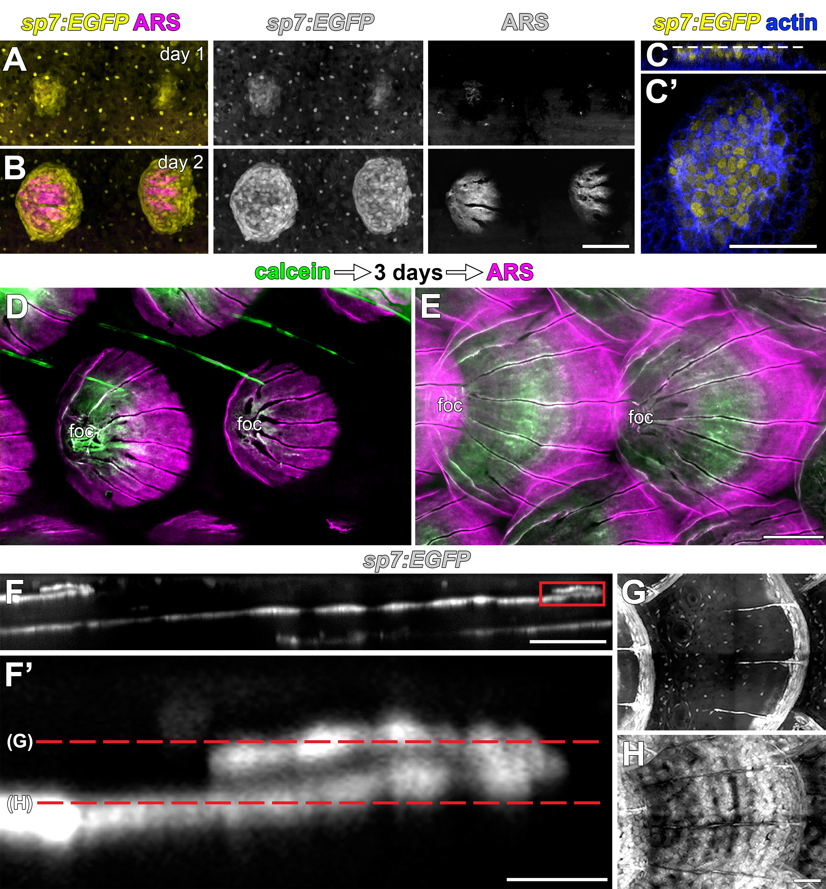 (A,B) Repeated live imaging of individual larvae revealed that calcified matrix, detected by Alizarin Red S (ARS) labeling (magenta) follows appearance of sp7:EGFP+ osteoblast like cells (yellow). (C,C’) Prior to initial ARS detection, sp7:EGFP+ scale forming cells were arranged in a bi-layered papilla. Phalloidin counter stain (blue) shows cell outlines. (D,E) Sequential labelling with calcein (green) and ARS (magenta) show that scales grow posteriorly from the initial center of calcification, which is retained as the scale-focus (foc). (D) Calcein labelling from initial scale formation. (E) Extending scales. (E–H) Osteoblast like cells are arranged in a monolayer along the deep aspect of the mature scale and loop around to cover the superficial aspect of growing posterior margin (boxed area in E). Scale bars, 100 µm (A, B, D, E); 50 µm (C, C’, F, G, H); 10 µm (F’).