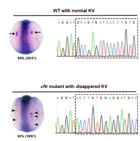 Genotype identification of cftr mutant. Sequencing result indicate that embryos with absent KV lumen and disordered PGCs carry the cftr mutant. Embryos at 8-somite stage were analyzed, and vasa probe was used in whole-mount in situ hybridization(WISH) assay.