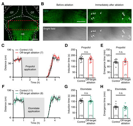 (G and H) Induction (G) and emergence time (H) of anesthesia induced by 30 μM etomidate for control (black) and off-target ablated larvae (green). Each symbol represents the data from a single larva. The number in the brackets indicates the number of larvae examined. The unpaired student’s t-test was performed for statistical analysis. n.s., not significant. Data are represented as mean ± SEM.
