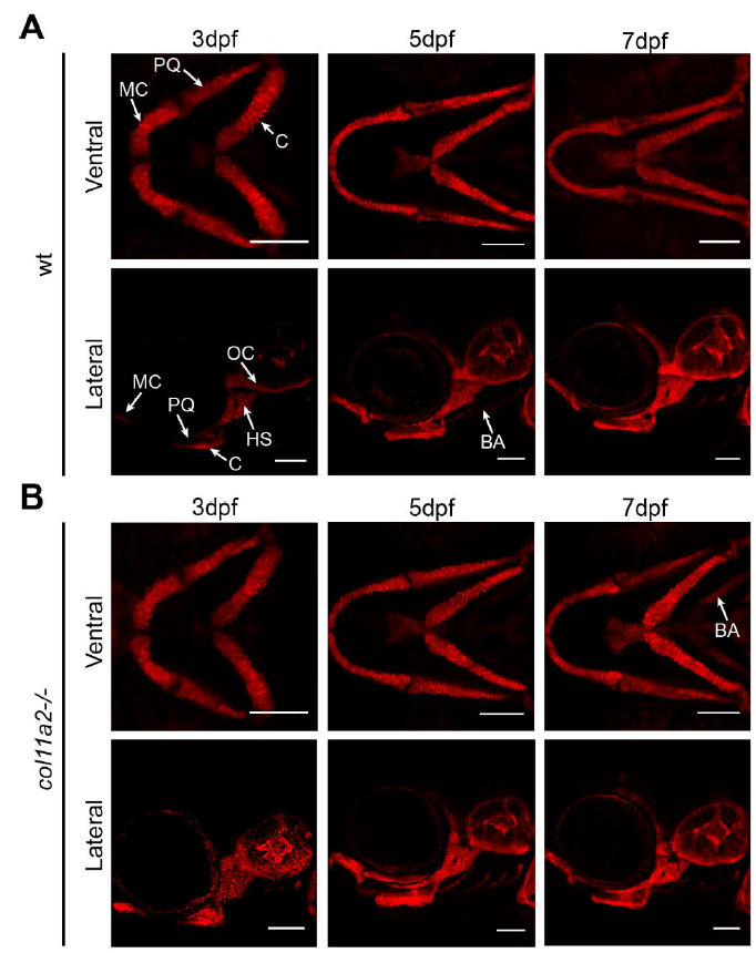 col2a1 expression in craniofacial cartilages is unaffected by loss of col11a2. Ventral and lateral views of wt (A) and col11a2-/- (B) zebrafish carrying Tg(col2a1a:mCherry). MC = Meckel's Cartilage, PQ = palatoquadrate, C = ceratohyal, HS = hyosymplectic, OC = otic capsule and BA = branchial arches, Scale bar = 100 µm