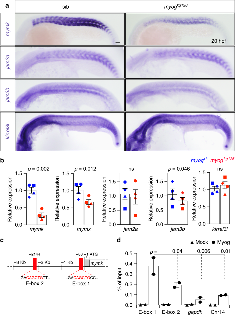 Myogenin mutants have reduced expression of fusogenic factors. a ISH on 20 hpf myogkg128/+ incross to investigate the expression of genes essential for vertebrate myocyte fusion. Expression of myomaker (mymk) and jam3b, but not of jam2a or kirrel3l, is reduced in myog mutant. Bar = 50 μm. Representative images n = 10 mutants, n = 38 sibs (mymk); n = 13 mutants, n = 37 sibs (jam2a); n = 12 mutants, n = 39 sibs (jam3b); n = 7 mutants, n = 13 sibs (kirrel3l). b qPCR analysis of RNA expression levels showing downregulation of mymk, myomixer/myomerger/minion (mymx) and jam3b at 20 hpf on myogkg125 mutants, whereas jam2a and kirrel3l remain unaltered compared to wt (myog+/+) sibs. Graphs show mean fold change ± SEM of four independent experiments; paired t test. Symbol shapes denote wt and mutant samples from paired experiments. c Schematic of 5' genomic region of mymk reporting: 5′-UTR and coding sequence (grey and white boxes), position of E-box elements (red boxes), relative bp distance from 5'UTR start (+1), start codon (arrow, ATG). E-box 1 and E-box 2 sequences are shown in red text. d ChIP-qPCR assay using anti-Myog or mock showing significant Myogenin enrichment on mymk E-box 1 compared to negative controls from the gapdh promoter and a gene-free region on chromosome 14 containing an E-box (Chr14). Mean of percentage of input immunoprecipitated ± SD of two independent experiments, ANOVA
