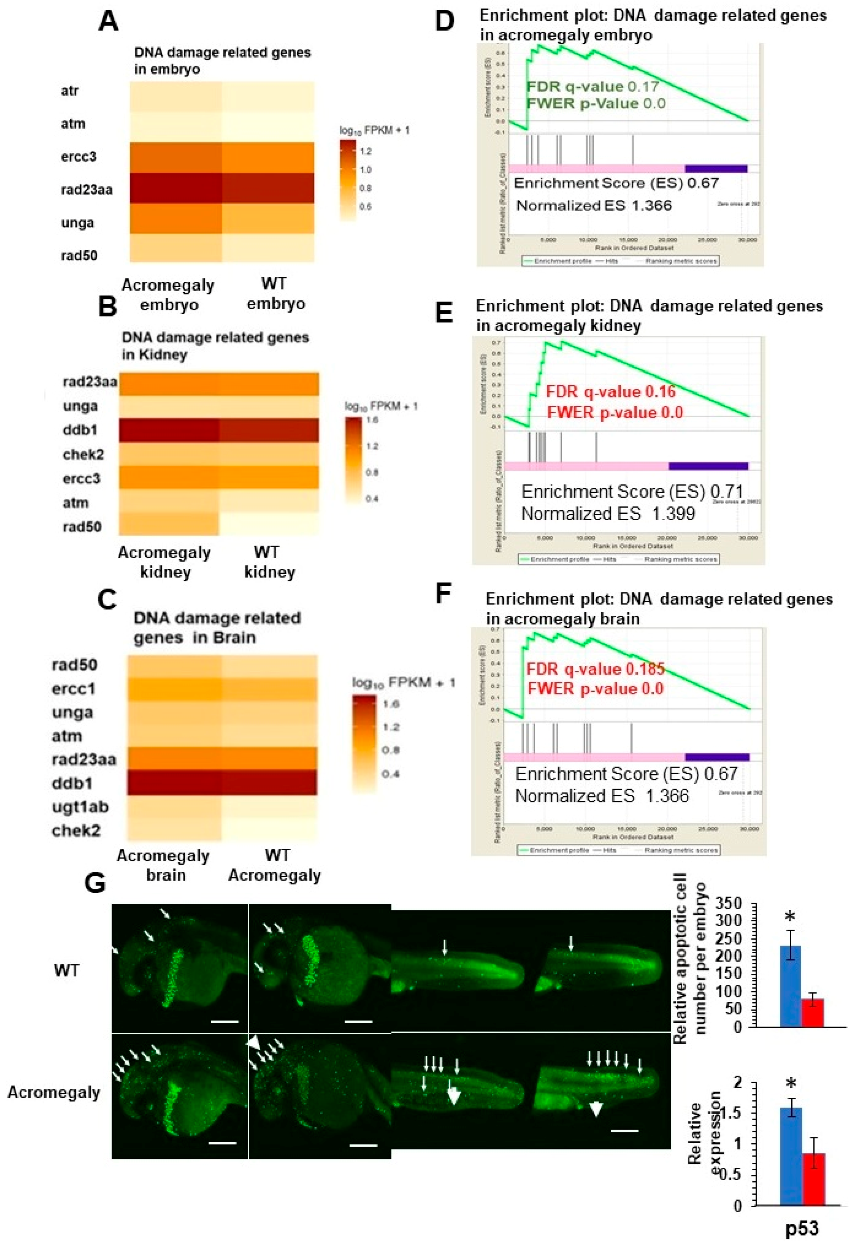 Increased DNA damage in various organs of acromegaly zebrafish model. (A–C) Heatmap of DNA damage markers in acromegaly larvae (3 dpf) (A), acromegaly kidney (one-year-old) (B), and acromegaly brain (one-year-old) (C) versus WT. (D–F) The results of GSEA showing the familywise-error rate (FWER) p-values, false discovery rate (FDR), enrichment scores (ES), and normalized ES of DNA damage markers in acromegaly larvae (3 dpf) (D), acromegaly kidney (one-year-old) (E), and acromegaly brain (one-year-old) (F) versus WT. Significant p-value < 0.05 and FDR q-value < 0.25 are written in red. According to GSEA [15], the reported p-value of 0.0 indicates an actual p-value of less than 0.01 (G) Representative Acridine orange (AO) staining and quantification of acromegaly model and WT larvae. The quantification of AO positive apoptotic cells was performed using Fiji software (left). P53 expression levels in the acromegaly model and WT larvae (right). Data are expressed as the mean ± SE (n = 3). Statistical difference (t-test, P < 0.05) is denoted by an asterisk.