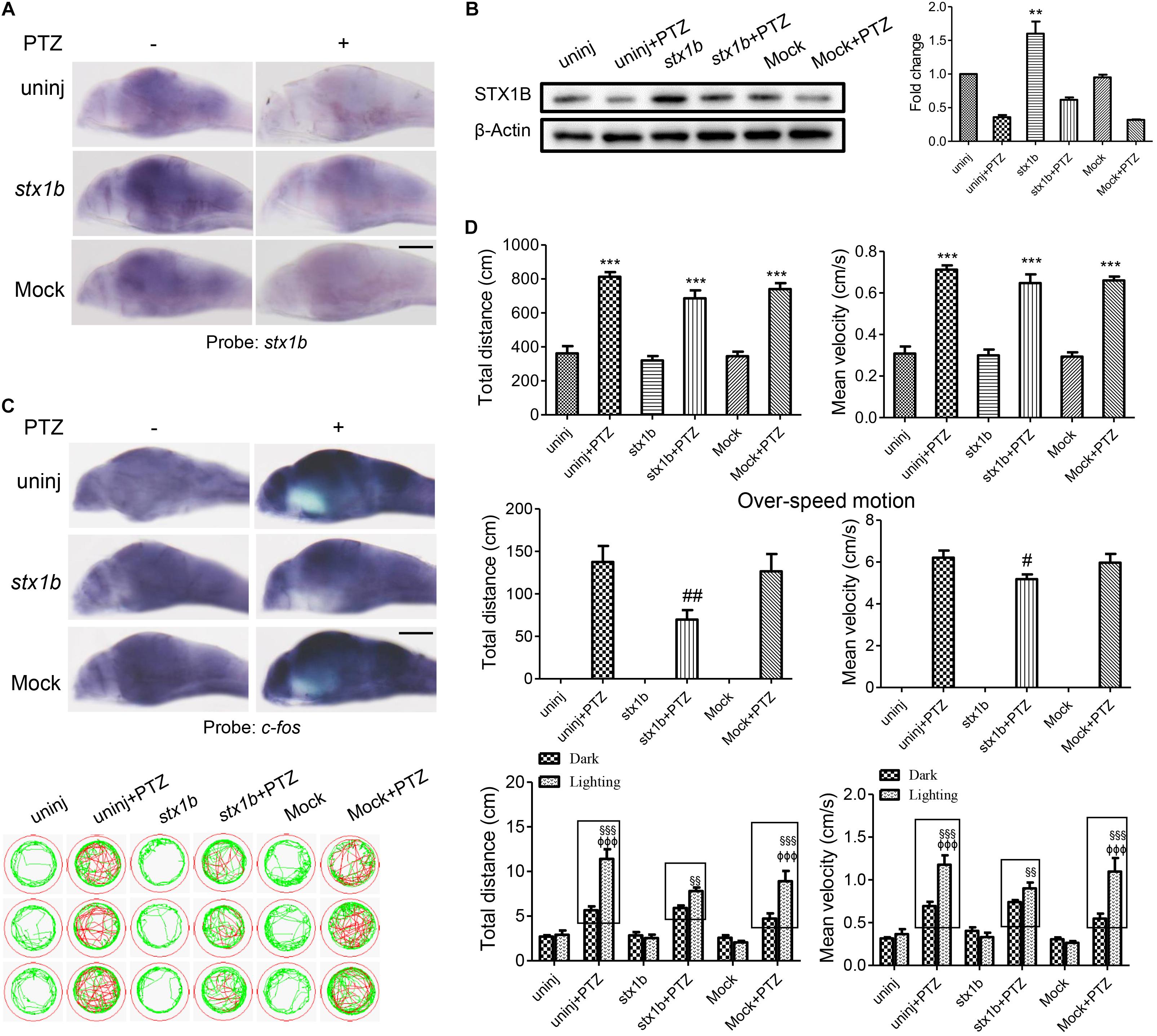 Larval seizure-like behavior was reduced by increased STX1B level in a PTZ-induced seizure model. (A) Both stx1b transcription in the wild-type and PTZ models were enhanced in larval (7 dpf) brains by stx1b injection as compared with that following no injection and mock injection (n = 20). (B) Western blotting confirmed differential levels of STX1B protein among the variant groups; notably, the STX1B level was raised in the stx1b-PTZ group as compared with in the PTZ-only group (n = 3). (C) c-fos messenger RNA was decreased by STX1B overexpression in the stx1b-PTZ model versus in the PTZ model group or the mock-PTZ group (n = 20). (D) The larval swimming experiment showed that, with STX1B overexpression, average speed and total distance were not obviously changed but abnormal pathway and overspeed were significantly decreased with 20 min in the dark condition, while photosensitive seizure was inhibited under the condition of light–dark shift in the PTZ-model larvae as compared with in the two groups of the PTZ-only model and the PTZ plus mock injection model (n = 24). The rectangles indicate differential responses between light–dark transitions in the three groups of the PTZ-model larvae. ∗∗P < 0.01 and ∗∗∗P < 0.001 vs. wild-type; #P < 0.05 and ##P < 0.01 vs. PTZ model; §§ P < 0.01 and §§§ P < 0.001 vs. wild-type in the light condition; ΦΦΦP < 0.001 indicates light vs. dark.