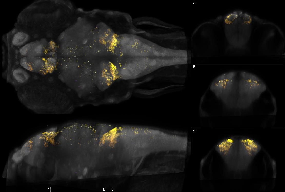Fig.151 Left: dorsal and sagittal maximal confocal projections from Zebrafish Brain Browser. Right: coronal slices at the indicated levels. Depth coded by color. Intensity represents mean expression in larvae transgenic for y549Et and Tg(bActin:Switch)y252 which expresses TagRFPT in rhombomere 2, rhombomere 4