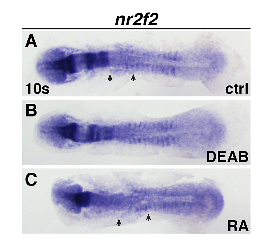 (A-C) Nr2f2 expression in the ALPM of control, DEAB-treated, and RA-treated embryos. View is dorsal with anterior left. Arrows indicated anterior and posterior limits of expression in control and RA-treated embryos.
