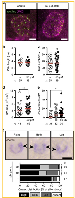 Atorvastatin impacts on the development of the temporal organ of laterality. a Confocal stacks of 6–8 somite stage (ss) Kupffer’s vesicle (KV). Cilia were stained with an antibody against acetylated tubulin (acetTub, green). Apical cell membranes to visualize the KV outline were stained with an antibody against atypical PKC (PKCζ, magenta). Scale bar: 20 µm. b Bar graph displaying the length of KV cilia in control and atorvastatin-treated embryos; n = 1231 (DMSO) and 1424 (50 µM atorv.) cilia; p = 0.6357, two-tailed Mann–Whitney test. c Cilia number per KV was not changed in the presence of atorvastatin; p = 0.6861, two-tailed t-test with Welch’s correction. d KV area was larger upon atorvastatin treatment. Each circle is one KV and embryo. ** p=0.0034. Two-tailed Mann–Whitney test. e Atorvastatin-treated embryos have more unciliated cells in the KV than control embryos. Cilia were stained using anti-acetylated antibody and KV cells were counted using the Sox17-GFP line. KV cells express high levels of GFP and can be distinguished from surrounding cells outside the KV. Each circle symbolizes one embryo; *p = 0.0375, Kruskal–Wallis test with Dunn’s multiple comparison test. f Atorvastatin disturbs correct spatial expression of charon. Representative images of in situ hybridization for charon at 10 ss with correct strong expression on right side and aberrant strong expression on both sides or left side (expression indicated by arrowheads; absent expression not shown). Scale bar: 50 µm. Stacked bar graphs summarises three experiments. Fisher’s exact test; n = 57 (DMSO), 51 (10 µM atorvastatin) and 60 (50 µM atorvastatin); ****p < 0.0001 for DMSO vs 10 µM as well as vs 50 µM. b–f Numbers of embryos analysed indicated below or next to graphs