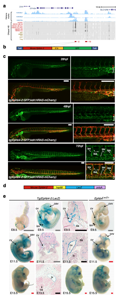 The vein-specific Ephb4-2 enhancer recapitulates endogenous Ephb4 expression in fish and mouse. a Region around the human EPHB4 gene as seen on UCSC Browser. Within histone marks, the three tracks show the enhancer-associated H3K4Me1 and H3K27Ac and promoter-associated H3K4Me3 marks found in human umbilical vein endothelial cells as light blue peaks. Within DNaseI hypersensitivity, the heat maps show DNaseI hypersensitive (HS) regions found in different cell lines, with endothelial cells labelled in red and non-endothelial cells labelled in orange. The endothelial histone marks and endothelial-specific DNase I hypersensitivity indicate two potential endothelial enhancer regions (named -2 and -10, marked as red horizontal lines). b, c The Tol2 Ephb4-2:E1b:GFP transgene (b) directs venous expression of the green fluorescent protein (GFP) reporter gene in a transgenic zebrafish line also expressing the pan-endothelial kdrl:HRAS-mCherry (c). No enhancer activity (as detected by GFP expression) was seen in the dorsal aorta, whereas robust activity was detected in the cardinal and ventral veins. Expression is detected in all intersegmental vessels. White scale bars are 100 μm. Red bracket = dorsal artery; white bracket = axial veins; isv = intersegmental vein. d, e The Ephb4-2:hsp68:LacZ transgene (d) directs vein-specific expression of the LacZ reporter gene in transgenic mice (e) as compared to Ephb4LacZ/+. Black scale bars are 100 μm, grey scale bars are 500 μm, red scale bars are 1000 μm. isv = intersomitic vessel, cv = cardinal vein, da = dorsal aorta, jv = jugular vein, ca = carotid artery, ccv = common cardinal vein, cev = branches of the cerebral venous plexus, lv = left ventricle.