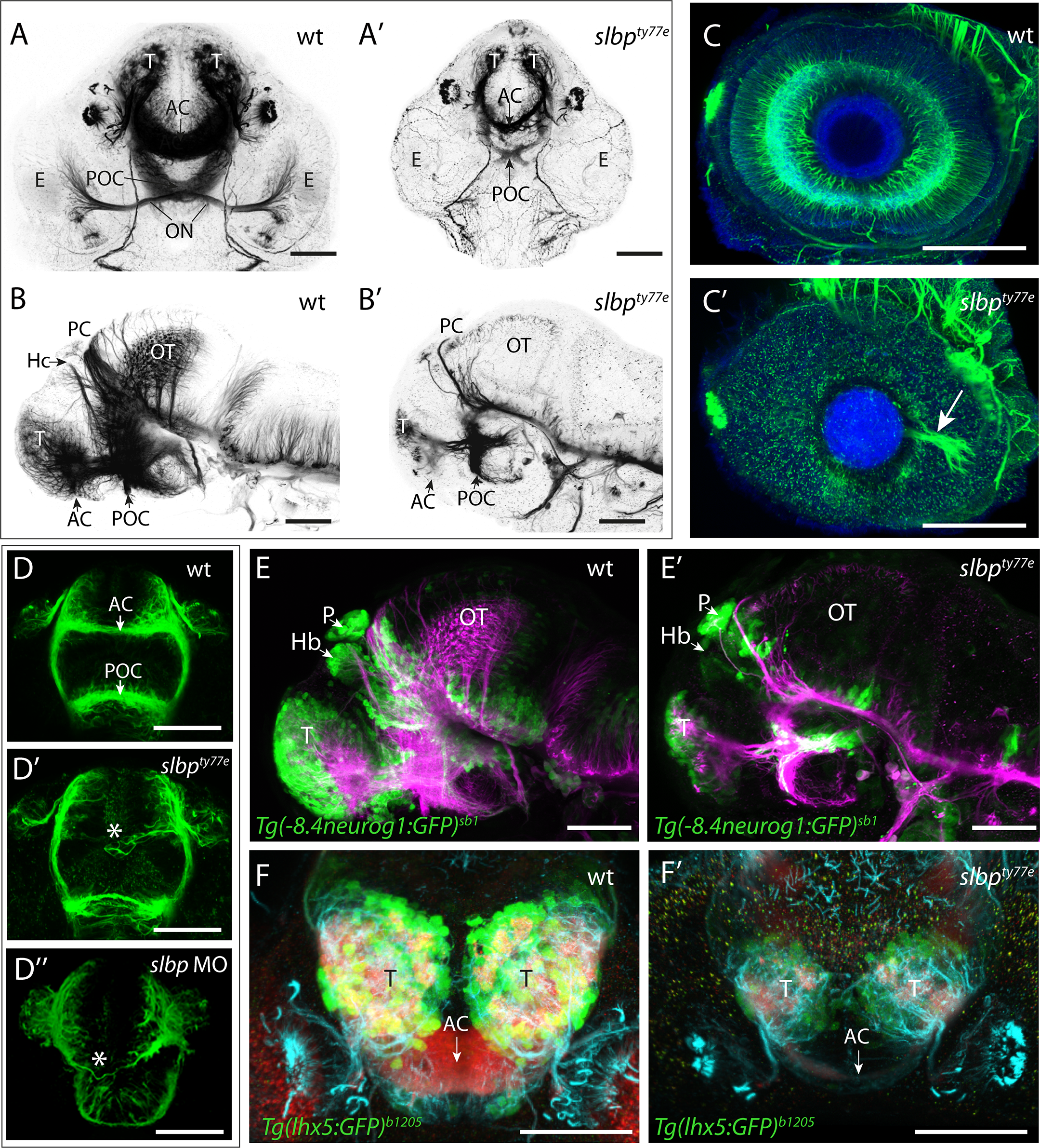 (A-D”) Acetylated α-tubulin labelling of wildtype (A-D) and ele mutant (A’-D”) embryo brains and eyes. Frontal (A-A’; D-D”) and lateral (B- B’) views of brains and lateral views of eyes (C,C’) of 3dpf (A-C’) and 30hpf (D- D”) wildtype (A-D), slbpty77e mutant (A’-D’) and morphant (D”) embryos. Arrowhead in C’ highlights the aberrant extension of RGC axons within the retina. The asterisks in D’-D” highlight aberrantly positioned axons near the midline commissural region in slbp mutant and morphant embryos. (E-E’) Lateral view with anterior to the left of 3dpf wildtype (E) and slbpty77e mutant (E’) embryos showing expression of the Tg(-8.4neurog1:GFP)sb1 transgene (green) labelled neurons and acetylated α-acetylated tubulin labelled axons/neurites (magenta). (F-F’) Frontal views of the telencephalon in 3dpf wildtype (F) and slbpty77e mutant (F’) embryos showing expression of the Tg(lhx5:GFP)b1205 transgene (green) labelled neurons, SV2 labelled neuropil (red) and acetylated α-acetylated tubulin labelled axons/neurites (cyan). Abbreviations: AC, anterior commissure; POC, post-optic commissure; ON, optic nerve; T, telencephalon; PC, posterior commissure; OT, optic tectum; Hb,habenula; E,eye; P,pineal. Scale bars: (A-C”, E, E’) 100μm (D-D”, F, F’) 50μm