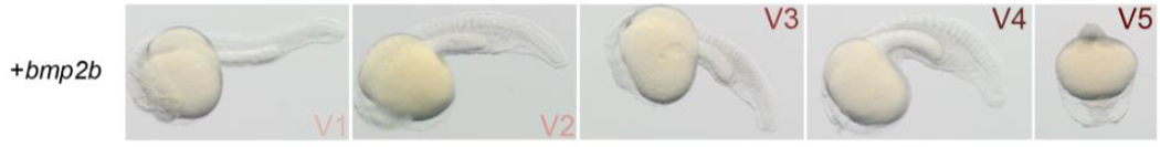 Ventralization effect of bmp2b. Ventralized morphology in 24hpf embryos injected with bmp2b mRNA. The embryos have been classified following five categories by order of severity (V1 to V5).