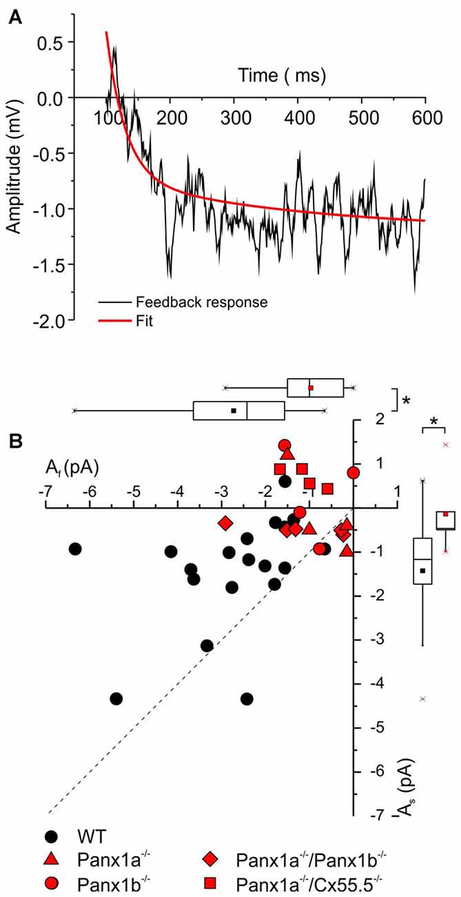 Fig. 5 Quantification of the two feedback components. A double exponential function was fitted through the feedback responses (See “Materials and Methods” section). (A) Representative feedback trace (black) with fitted curve (red). (B) Scatter plot of the fast (x-axis) and the slow (y-axis) feedback component for WT (black symbols) and the Panx1−/− animals combined (red symbols). The dotted line indicates equal amplitude for the fast and the slow feedback component. All the WT points are above this line, indicating that the amplitude of the fast feedback component is the largest. In the Panx1−/− animals both the fast and the slow feedback component are significantly reduced. *p < 0.05.