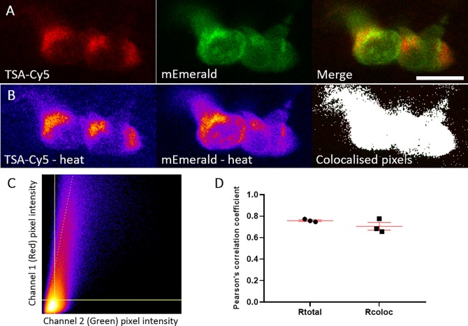 A) Representative photomicrograph shown as single focal plane of lyz:MPO-mEmerald (Green) larvae fixed at 3 dpf and chemically stained with TSA-Cy5 (Red). Scale bar 10 μm. B) Pseudocoloured (heat) images of Red and Green channels and image of colocalised pixels above threshold. C) Scatter plot of channel 1 (Red) vs. channel 2 (Green) of the image shown in A and B. The regression line is plotted along with the threshold level for channel 1 (vertical line) and channel 2 (horizontal line). D) Pearson's correlation coefficient for the entire image (Rtotal) or for the pixels above thresholds (Rcoloc) of 3 tested field of views. Mean +/- SEM are indicated in red.