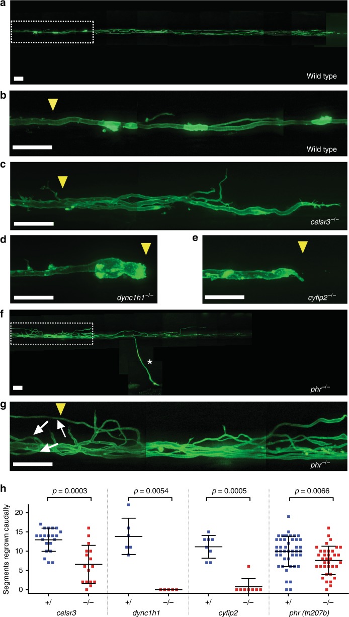 Celsr3, dync1h1, cyfip2, and phr are required for the extent of caudally directed Mauthner axonal regrowth. ah Mauthner axons were labeled in double transgenic zebrafish larvae: Tg(hspGFF62a), expressing Gal4 in the Mauthner combined with Tg(UAS:gap431–20-citrine), driving expression of membrane-attached citrine. Extent of caudally directed Mauthner axonal regrowth at 48 hpt is shown. A stitched low magnification image of the entire length of a regrown wild-type axon is shown in (a). b is the zoomed-in image of the boxed area in (a), showing the regrown wild-type axon around and caudal to the transection site. At the same magnification as the regrown wild-type axon in (b), images of celsr3, dync1h1, and cyfip2-mutant axons at 48 hpt are shown (ce), quantified in (h), demonstrating that celsr3, dync1h1, and cyfip2 are required for the extent of Mauthner axonal regrowth. At the same magnification as the regrown wild-type axon in (a), an image of a regrown phr mutant axon around and caudal to the transection site is shown in (f) and a zoomed-in image of the boxed area in (f) is shown in (g), quantified in (h), demonstrating that PHR is also required for the full extent of caudally directed Mauthner axonal regrowth. An extraspinally regrown axon branch is marked by a white asterisk (f). In addition to the caudally regrown axon, several branches have regrown rostrally (white arrows), towards the neuronal cell body in the brain stem. Transection sites are marked by a yellow arrowhead. All scale bars are 30 µm. P-values in (h) were determined using two-tailed Student’s t-test (celsr3, phr) or Mann–Whitney test (dync1h1, cyfip2). N = 21 nonmutant celsr3 siblings, n = 16 celsr3 mutants, n = 6 nonmutant dync1h1 siblings, n = 5 dync1h1 mutants, n = 8 nonmutant cyfip2 siblings, n = 8 cyfip2 mutants, n = 48 nonmutant phr siblings, n = 36 phr mutants were analyzed