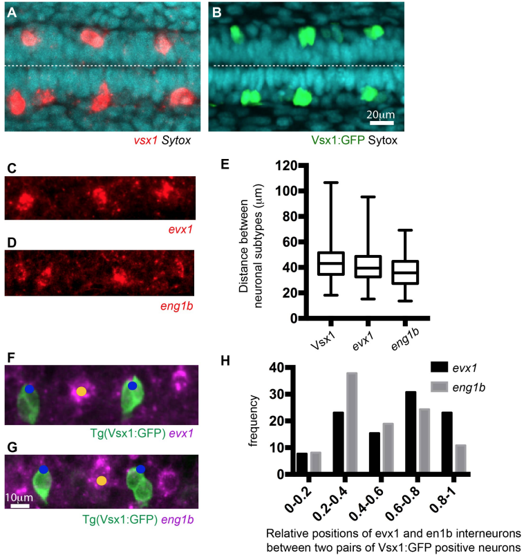 Neuronal spacing pattern in the zebrafish spinal cord (related to Figure 4). A) and B) Dorsal views of Vsx1 expressing cells revealed by in situ hybridization (A) and Vsx1:GFP transgene expression (B) at 20 hfp. Dashed line shows the apical surface. C) and D) Lateral views of evx1 (C) and eng1b (D) expressing spinal neurons revealed by in situ hybridization at 20hpf. E) Box-and-whisker plot showing the distance between neurons of the same subtype in the most caudal spinal region at 20hpf (mean ± SD; Vsx1:GFP: 44.4 ± 14.1 µm, n=18; evx1: 41 ± 15.4 µm, n=7; eng1b: 35.7 ± 13.3 µm, n=5 embryos). The line inside the box represents the median and whiskers represent minimum and maximum values. Data analysed using Kruskal-Wallis with Dunn’s multiple comparison test (non-significant). F and G) Dorsolateral views showing the relative positions of Vsx1:GFP and evx1 (F) or eng1b (G) expressing cells revealed by in situ hybridisation. H) Frequency distribution chart shows the relative positions of evx1 and en1b expressing interneurons between two pairs of Vsx1:GFP expressing neurons. The distance between the two pairs of Vsx1:GFP neurons has been normalised from 0 (anterior) to 1 (posterior). All evx1 and eng1b expressing neurons that shared the same position with a Vsx1 neuron have been included in position (1).