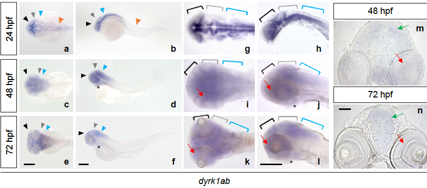 dyrk1ab is expressed in the developing brain region. By WISH (whole mount in situ hybridization), dyrk1ab was expressed in the forebrain (black arrowheads, a-f; black brackets, g-l), the midbrain (gray arrowheads, a-f; gray brackets, g-l), the hindbrain (blue arrowheads, a-f; blue brackets, g-l) at 24, 48 and 72 hpf and the spinal cord (orange arrowheads, a and b) at 24 hpf. It was also detected in the heart (asterisks, d, f, j and l) and in the retina (red arrows, i-l) at 48 and 72 hpf. (m and n) Sectioned images of WISH embryos showed the expression of dyrk1ab in the tectum (green arrows) and the retina (red arrows) at 48 hpf and 72 hpf. Scale bars: 200 μm in (a-l) and 50 μm in (m and n)