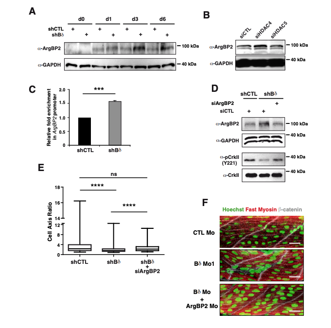 PP2A-Bδ controls expression of ArgBP2 via HDAC4. (A) Western blot analysis of ArgBP2 levels in C2C12 myoblasts transfected with a control (siCTL), anti-HDAC4 (siHDAC4) or anti-HDAC5 (siHDAC5) siRNA. GAPDH (αGAPDH) was used as loading control. (B) ChIP analysis of MEF2 binding to the ArgBP2 promoter in control (shCTL) and BδKD (shBδ) C2C12 myoblasts at day 3. Immunoprecipitations were realized with a control IgG or an anti-MEF2 antibody. Results are expressed as mean percent of input ± SD, relative to the control IgG and standardized to shCTL cells, from 3 independent experiments, unpaired two-tailed t-test, *** P<0.001. (C) Western blot analysis of ArgBP2 (α-ArgBP2) in control (shCTL) and Bδ-knocked down (shBδ) C2C12 myoblasts at the indicated time points during the differentiation process. GAPDH (α-GAPDH) was used as loading control. Images are representative of 2 independent experiments. (D) Analysis of ArgBP2 (α-ArgBP2) and activity of CrkII as assessed by phosphorylation of its inhibitory Y221 (α-pCrkII (Y221)) in control (shCTL) and Bδ-knocked down (shBδ) C2C12 myoblasts transfected with a control siRNA or a siRNA against ArgBP2 (siArgBP2). GAPDH (α-GAPDH) and total CrkII (α-CrkII) were used as loading control. (E) Major/minor cell axis ratio in control (shCTL) and Bδ-knocked down (shBδ) C2C12 myoblasts grown in GM and transfected with a control siRNA or an siRNA against ArgBP2 (siArgBP2). Results were calculated on >200 cells/experiment from 2 independent experiments, unpaired two-tailed t-test, **** P<0.0001. (F) Representative confocal pictures of fast skeletal myosin (red) and β-catenin (white) in control (CTL Mo, n=6 independent experiments) or PP2A-Bδ (Bδ Mo, n=6 independent experiments) morphant embryos, injected with morpholino against ArgBP2 (ArgBP2 Mo, n=10 independent experiments). Nuclei of fast skeletal fibers were stained with Hoechst (green). Scale bars are 100µm