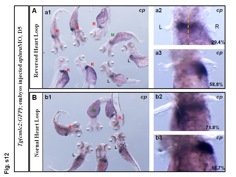 (A. a1-a3) The liver LR patterning for the embryos displayed reversed loop heart in aplnramorphants. Of them, 29.4% of embryos displayed left-sided liver (A. a2, n=17); 58.8% of the embryos displayed right-sided liver (A. a3, n=17). (B. b1-b3) The liver LR patterning for the embryos displayed normal loop heart in aplnramorphants. Of the embryos, 71.8% of the embryos displayed left-sided liver (B. b2, n=32); 18.7% of embryos displayed right-sided liver (B. b3, n=32).