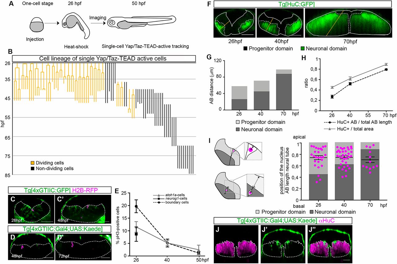Boundary cells switch their proliferative behavior over time. (A) Scheme depicting the outline of the experiment: Tg[4xGTIIC:GFP] embryos were injected at the one-cell stage with hsp:H2B-RPF and heat-shocked at 26 hpf, or were injected at the eight-cell stage with H2B-mCherry (not shown). Embryos displaying red nuclei within the Yap/Taz-active boundary cells were then imaged up to the desired stage (Fig. S2). (B) Representation of the Yap/Taz-TEAD active cell lineage tree with the y-axis displaying the time of embryonic development in hours post-fertilization (hpf). The 63 cell lineages are displayed from the moment of tracking onwards and are color-coded according to proliferative behavior (orange, dividing; black, non-dividing). Each line corresponds to a single cell tracked starting from the beginning of the movie until the end (Table 1); branches indicate cell divisions. An interrupted line means either the end of the movie or that the cell was lost from the field. There is a switch in cell proliferative behavior from 40 hpf onwards, from which time most of the 4xGTIIC:GFP cells do not divide and therefore do not branch. Yap/Taz-active derivatives can be tracked beyond Yap/Taz-TEAD activity due to the stability of the GFP protein. (C,C′) Stills from a time-lapse movie that followed a single cell from 26 hpf to 48 hpf; the cell underwent two cell divisions giving rise to four cells (Movie 1). (D,D′) Representative example of a group of three cells photoconverted at 48 hpf and followed until 72 hpf. The number of cells does not change during this 24 h period, supporting the previous observation of a switch in cell proliferation behavior. (E) Graph showing the percentage of cells undergoing cell division over time in different hindbrain cell populations: Yap/Taz-TEAD proliferating boundary cells (black circles and dashed line); atoh1a-positive rhombomeric cells (gray triangles and solid line) and neurog1-positive cells (black square) in the flanking boundary regions. There is a difference in the percentage of cells undergoing mitosis in boundaries (19%) versus other hindbrain territories (atoh1a-positive cells, 11.5%; neurog1-positive cells, 8.5%) at 26 hpf; the boundary cell population dramatically changes its proliferative behavior after the offset of Yap/Taz-activity (5.7% at 40 hpf). (F) Images showing the development of the neuronal differentiation domain in Tg[HuC:GFP] embryos from 26 hpf to 70 hpf. (G) Histogram displaying the actual size of the progenitor versus neuronal domains at the indicated stages. Data were obtained from Tg[HuC:GFP] embryos whose apicobasal (AB) length was measured (the length extending from the apical ventricular zone edge to the basal mantle zone according to cell orientation within the neural epithelium; n=8-10 boundaries of four or five embryos/stage). There is a dramatic increase in the size of the neuronal domain at the expense of the progenitor domain over time. (H) Comparison of the two methods used for growth assessment. The ratio of distances measured between the apical/ventricular and basal/mantle borders of the HuC domain (black circles and dashed line) versus the measurement of the HuC area (gray triangles and solid line) of an average of 12-18 boundaries (6-9 embryos) is shown. These two approaches provide equivalent estimates of progenitor/neuronal domain progression. (I) Analysis of the position along the apicobasal axis of the nuclei of cells tracked in B at different times. Positional values were plotted (magenta dots) and overlaid with the information obtained from the progenitor/neuronal map. Briefly, nuclear position was scored by measuring the distance from the cell nucleus to the apical side, according to the drawing, and the result was normalized taking into consideration the thickness of the neural tube (see Materials and Methods). Most of the cell nuclei lay within the progenitor domain (light-gray zone) at 26 hpf, whereas at 70 hpf they were mainly located in the neuronal differentiated domain (dark-gray zone). (J-J″) Immunostaining of Tg[4xGTIIC:Gal4;UAS:KAEDE] embryos using anti-HuC antibodies at 50 hpf, showing derivatives of Yap/Taz-active cells within the HuC-positive domain. Although cells within the neuronal domain are not active for Yap/Taz (as shown in Fig. 2), their derivatives can be tracked due to the stability of the KAEDE protein. Scale bars: 50 µm.