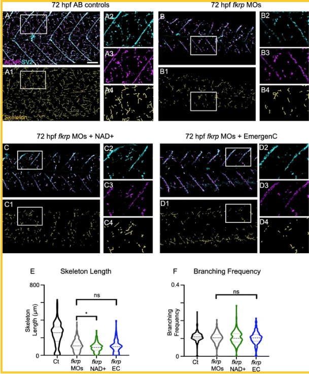 Supplementation with NAD+ or EmergenC after muscle development does not improve NMJ morphology in fkrp morphants. (A-D4) Anterior left, dorsal top, side-mounted embryos at 72 hpf with labeled AChRs and SV2. (Lettered panels) Merged channels of AChR and SV2. (1) Skeletonized images. (2) Magnification of SV2 channel. (3) Magnification of AChR channel. (4) Magnification of skeleton channel. (A–A4) Control embryo. (B–B4) fkrp morphant embryo exhibiting a reduced degree of distributed innervation within the myotome. (C–C4) fkrp morphant embryo treated with NAD+ at 24 hpf also has reduced innervation. (D–D4) fkrp morphant embryo treated with EmergenC at 24 hpf has reduced NMJs. (E) Length of skeletons per myotome in control embryos (n = 288 half-myotomes), fkrp morphants (n = 303 half-myotomes), and fkrp morphants receiving NAD+ (n = 225 half-myotomes) or EmergenC (n = 225 half-myotomes) at 24 hpf. Note that skeleton length is actually significantly decreased in fkrp morphants receiving NAD+ at 24 hpf. (F) Degree of branching within the myotome in control embryos (n = 283 half-myotomes), fkrpmorphants (n = 295 half-myotomes), and fkrp morphants receiving NAD+ (n = 221 half-myotomes) or EmergenC (n = 210 half-myotomes) at 24 hpf. Scalebars are 50 μm. *p < 0.05, **p < 0.01, ***p < 0.001, ns non-significant