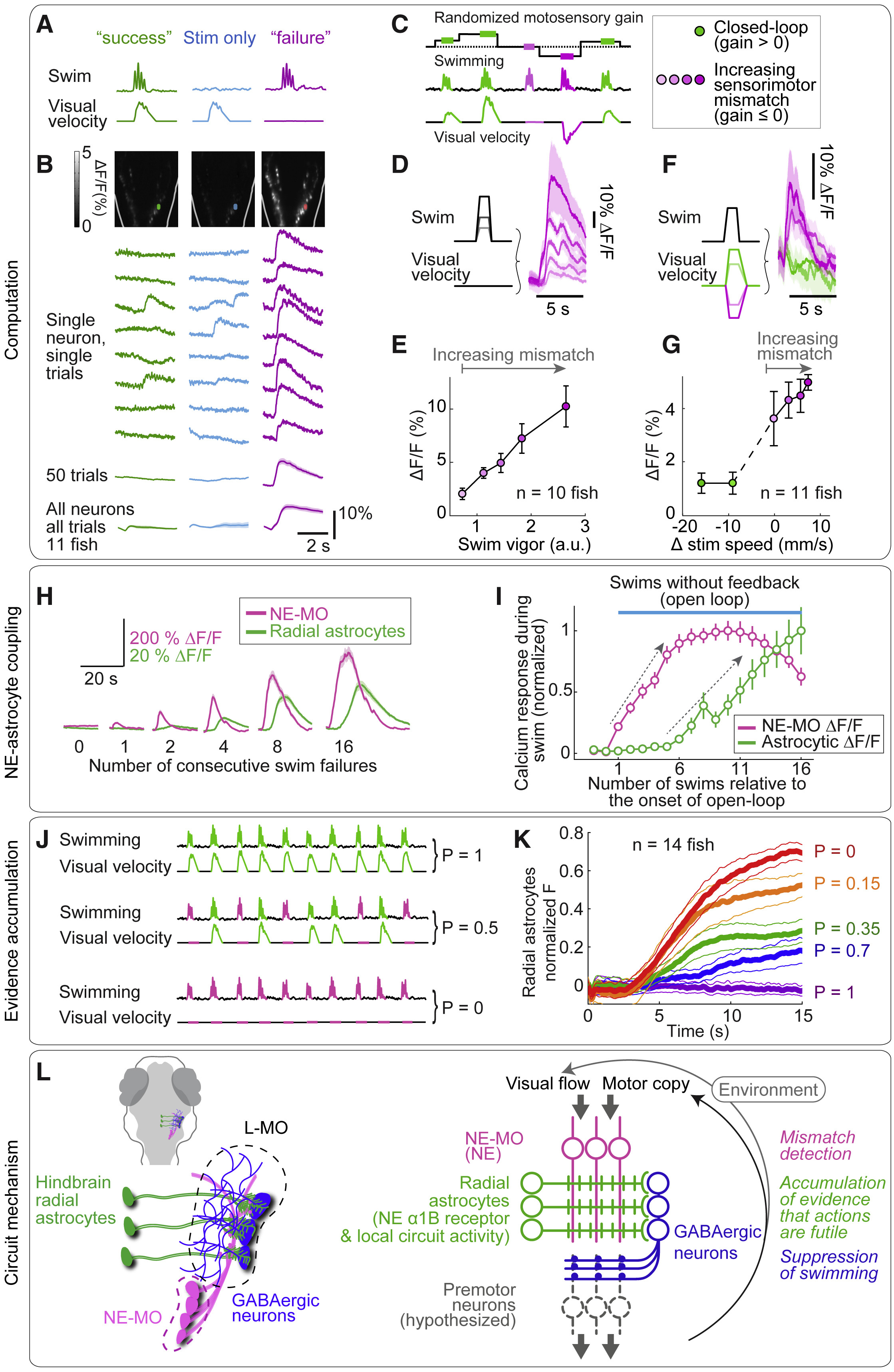 (K) Information accumulation in radial astrocytes. Ca2+ signal, averaged over fish and trials, reflects P, the probability that a swim bout gives visual feedback, so glia accumulate information on swim futility over time (n = 14 fish).