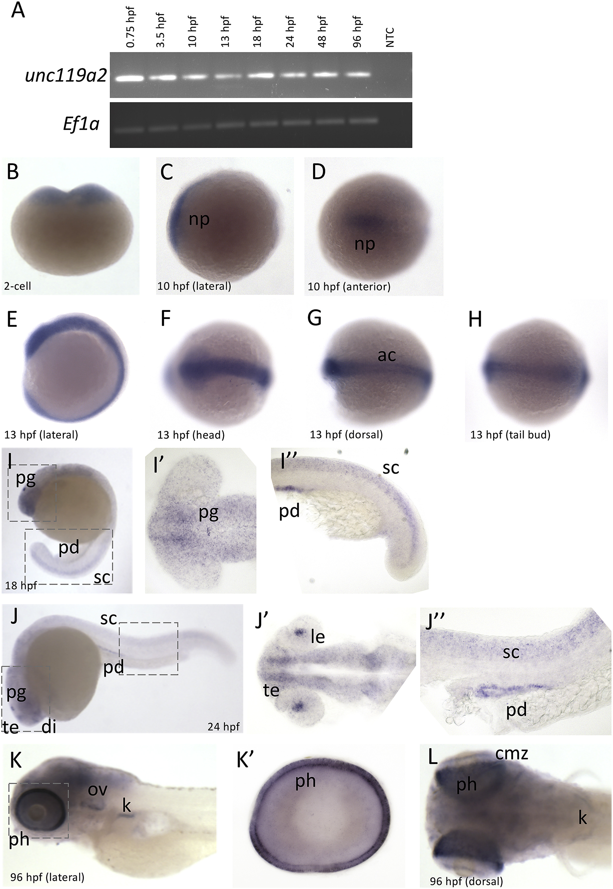 Temporal and spatial expression of zebrafish unc119a2. A. RT-PCR of unc119bat various embryonic time-points (0.75 hpf (2-cell), 3.5 hpf, 10 hpf, 13 hpf, 18 hpf, 24 hpf, 48 hpf, and 96 hpf) compared to Ef1a. B. 2-cell WISH. C-D. 10 hpf WISH. E-H. 13 hpf WISH. I. 18 hpf WISH. Boxed regions are represented in flatmounts of the head (I′) and tail (I″). J. 24 hpf WISH. Boxed regions are represented in flatmounts of the head (J′) and tail (J″). K. Lateral view of 96 hpf WISH. Boxed region is represented in eye flatmount (K′). L. Dorsal view of 96 hpf WISH embryo. Abbreviations: ac, adaxial cells; cmz, ciliary marginal zone; di: diencephalon; k, kidney; le, lens; np, neural plate; NTC, non-template control; ov, otic vesicle; pd, pronephric duct; pg, pineal gland; ph, photoreceptors; sc, spinal cord; te: telencephalon.