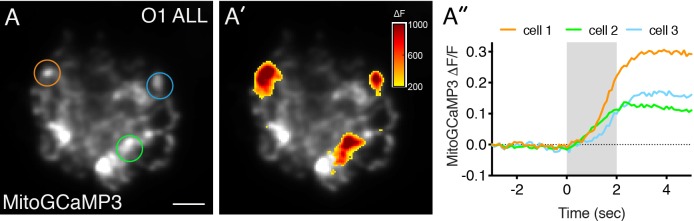 (A) A live Image of an anterior-lateral line (ALL) neuromast viewed top-down, expressing the mito-Ca2+ sensor MitoGCaMP3 at 5 dpf. (A’) shows the spatio-temporal dynamics of evoked mito-Ca2+ signals during a 2 s stimulation. The MitoGCaMP3 signals during the stimulation (∆F) are indicated by the heatmap overlaid onto the baseline grayscale image. (A’’) Temporal traces of evoked mito-Ca2+ signals were generated from three regions denoted by three circles in A. Scale bar = 5 µm in A.