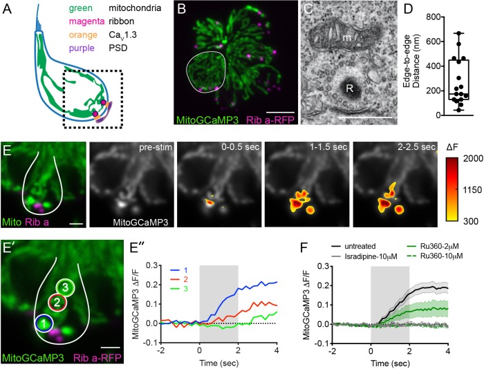 (A) Cartoon illustration of a lateral-line hair cell containing: an apical mechanosensory bundle (blue), mitochondria (green), presynaptic ribbons (magenta), CaV1.3 channels (orange) and postsynaptic densities (purple). (B) Airyscan confocal image of 6 live hair cells (1 cell outlined in white) expressing MitoGCaMP3 (mitochondria) and Ribeye a-tagRFP (ribbons) in a developing neuromast at 2 dpf. Also see Figure 1—figure supplement 1. (C) A representative TEM showing a mitochondrion (m) in close proximity to a ribbon (R) at 4 dpf. (D) Quantification of mitochondrion to ribbon distance in TEM sections (n = 17 ribbons). (E) Side-view of a hair cell (outlined in white) shows the spatio-temporal dynamics of evoked mito-Ca2+ signals during a 2 s stimulation at 6 dpf. The change in MitoGCaMP3 signal (∆F) from baseline is indicated by the heatmap and are overlaid onto the pre-stimulus grayscale image. (E’-E’’) Circles 1–3 (1.3 μm diameter) denote regions used to generate the normalized (∆F/F0) temporal traces of mito-Ca2+ signals in E’’: adjacent to the presynapse (‘1’), and midbody (‘2’ and ‘3’) in the same cell as E. (F) Average evoked mito-Ca2+ response before (solid black) and after 30 min treatment with 10 μM Ru360 (dashed green), 2 μM Ru360 (solid green), or 10 μM isradipine (gray) (3–5 dpf, n ≥ 9 cells per treatment). Error bars in D are min and max; in F the shaded area denotes SEM. Scale bar = 500 nm in C, 5 µm in B and 2 µm in E and E’.