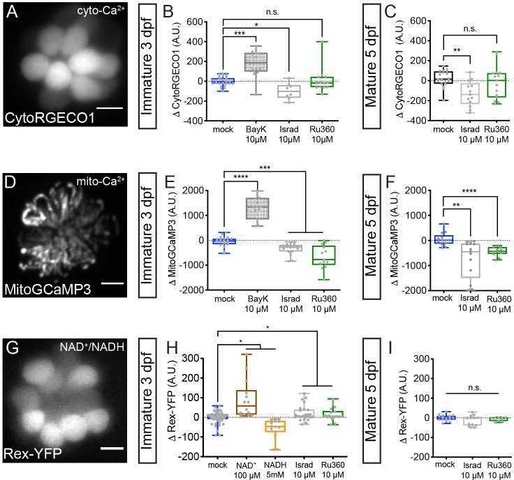 Live hair cells expressing RGECO1 (A), MitoGCaMP3 (D), or Rex-YFP (G) show resting cyto-Ca2+, mito-Ca2+ or NAD+/NADH levels respectively. (B-C) RGECO1 baseline measurements before and after a 30 min mock treatment (0.1% DMSO) or after a 30 min 10 μM Bay K8644 (BayK), 10 μM isradipine, or 10 μM Ru360 treatment. (E-F) MitoGCaMP3 baseline measurements before and after a 30 min mock treatment (0.1% DMSO) or after a 10 μM BayK, 10 μM isradipine, or 10 μM Ru360 treatment. (H-I) Rex-YFP baseline measurements before and after 30 min mock treatment (0.1% DMSO) or after a 30 min 100 μM NAD+, 5 mM NADH, 10 μM isradipine, or 10 μM Ru360 treatment. All plots are box-and-whiskers plot that show median, min and max. N ≥ 9 neuromasts per treatment. A one-way Brown-Forsythe ANOVA with Dunnett’s T3 post hoc was used to calculate the difference in (B-C), (E-F), and a one-way Brown-Forsythe and Welch ANOVA with Holm-Sidak’s post hoc was used in H-I, *p<0.05, **p<0.01, ***p<0.001, ****p<0.0001. Horizontal lines in E, H, and I indicate that both conditions had similar p values compared to mock treatment. Scale bar = 5 μm in A, D and G.
