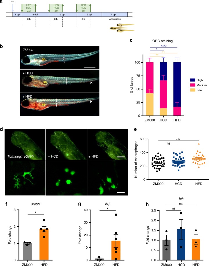 High fat diet induces lipid and macrophage accumulation in zebrafish. a Schematic representation of the protocol used for the experiments. Zebrafish larvae were fed with high fat (HFD), high cholesterol (HCD) or standard (ZM) diet for 6 h each day from day 4 to day 6 post fertilization (dpf). PTU: 1-phenyl 2-thiourea. b 7 dpf Casper zebrafish larvae, fixed and stained with Oil Red O: representative low (i), medium (ii), and high (iii) staining levels un larvae fed with the indicated diet are shown. SB: swim bladder. Arrows point to lipids in blood vessels; arrowheads point to lipid droplets in the tail region; asterisks indicate the intestine. Dark-field images, calibration bar: 500 μm. c Percentage of larvae with high, medium and low lipid accumulation for the three indicated diets. Data are pooled from two experiments (n > 12) and the charts show the mean ± SEM. Blue asterisks refer to statistics of low stained larvae, red asterisks refer to statistics of high stained larvae. ****p-value < 0.0001, **p-value < 0.01, *p-value < 0.05 (two-way ANOVA test). d Representative fluorescent images of the head + yolk regions of larvae obtained using the Operetta system (i–iii—calibration bar: 100 μm) and the confocal microscope (i′–iii″—calibration bar: 20 μm). e Quantification of macrophages for the three considered diets. f–h Quantitative PCR analysis of the expression of sterol regulatory element binding transcription factor 1 (srebf1), interleukin-1 beta (il1β) and bruton tyrosine kinase (btk) in larvae fed and treated as indicated. In e data are pooled from three or more experiments (n > = 26) and **p-value < 0.01, *p-value < 0.05 (Mann–Whitney test). Source data are provided as a Source Data file