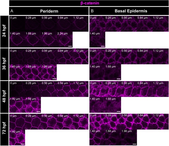 Immunostaining of β-catenin reveals that the adherens junctions are present along the apicobasal axis in periderm (