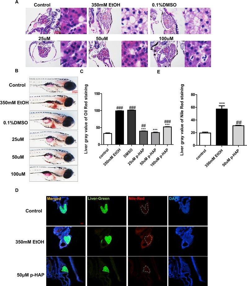 P-HAP attenuated hepatic steatosis induced by alcohol in zebrafish larvae. (A) H&E staining of the liver in zebrafish larva. Figures are magnified as 400×. (B) Lipid droplets in the whole-mount zebrafish liver were stained with oil red O after P-HAP treatment. Figures are magnified as 50×. (C) Oil red O staining of zebrafish larvae treated with 350 mM ethanol, 0.1% DMSO, and 25 μM, 50 μM, or 100 μM p-HAP and control zebrafish larvae were quantitatively analyzed. (D) The frozen liver sections from zebrafish larvae treated with 50 μM p-HAP were stained with Nile red. Figures are magnified as 200×. (E) Quantitative analysis of Nile red staining in zebrafish larvae. Data are expressed as the mean ± SD, n = 10 per group from two experiments using one-way analysis of variance (ANOVA) followed by Tukey’s multiple comparison test; ##P < 0.01, ###P < 0.001 vs control group, ***P < 0.001 vs model group.